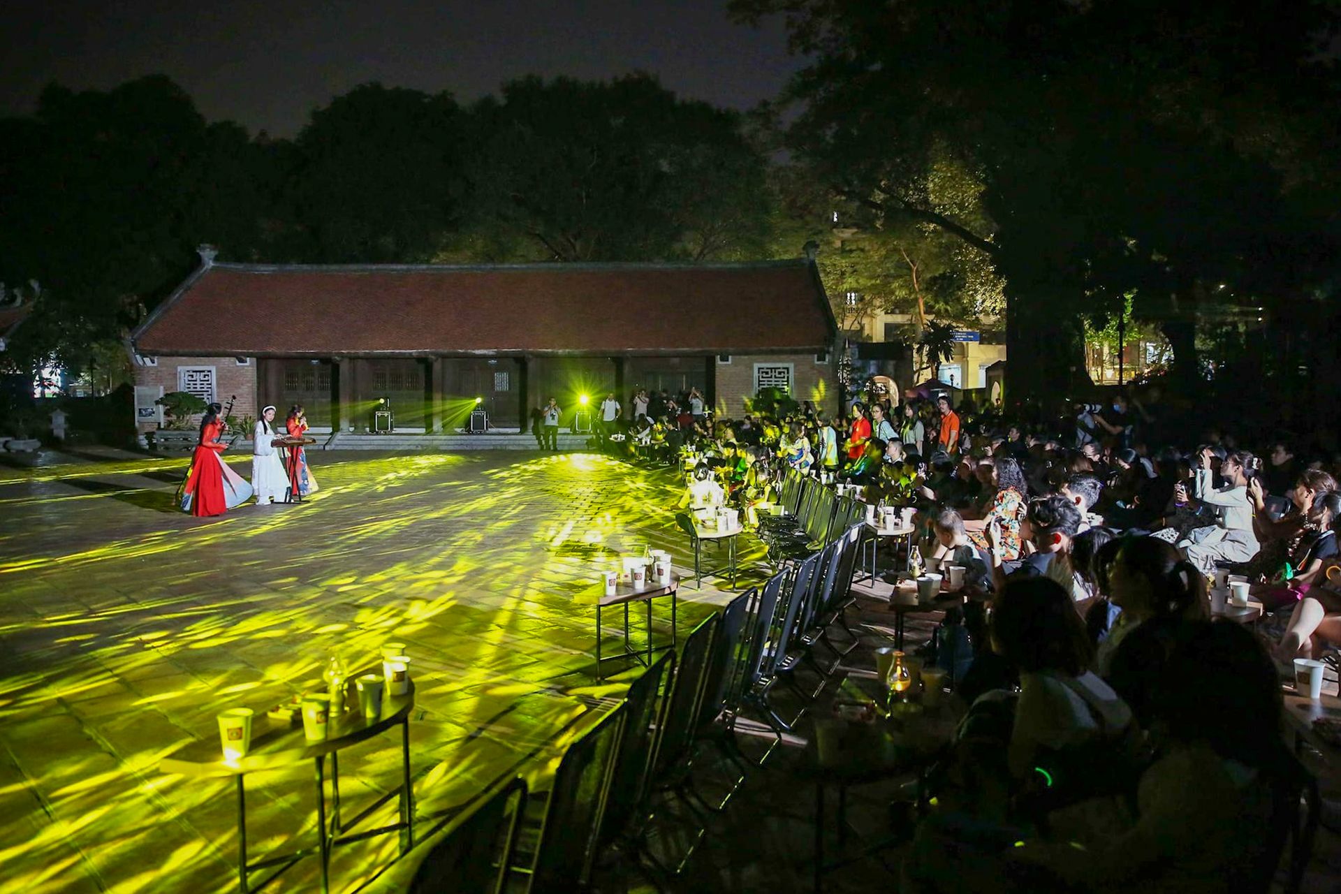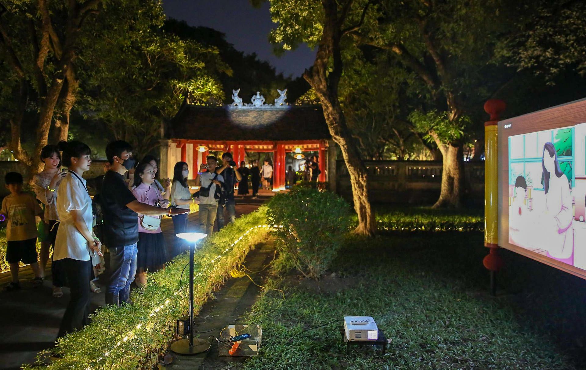 Khách du lịch trải nghiệm chương trình “Tour đêm Văn Miếu-Quốc Tử Giám”. (Ảnh: THÀNH NGUYỄN)