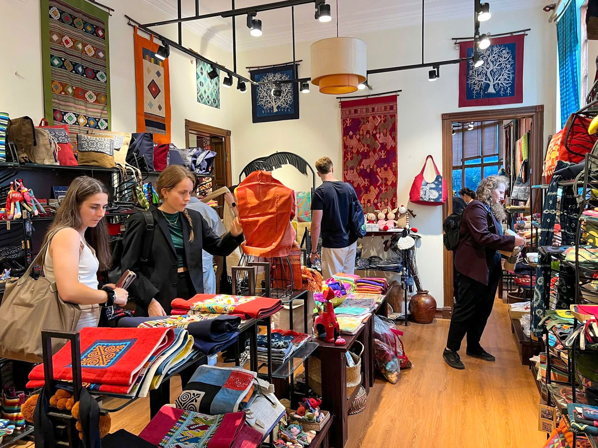Khách du lịch nước ngoài mua sắm các sản phẩm lưu niệm tại cửa hàng của Công ty cổ phần Doanh nghiệp xã hội Craft Link. (Ảnh: HOÀI THU)
