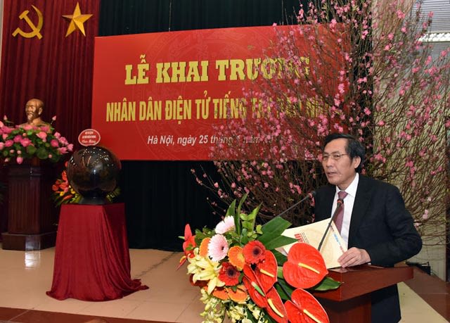 Tổng Biên tập Thuận Hữu phát biểu tại Lễ khai trương Nhân Dân điện tử tiếng Tây Ban Nha năm 2019. Ảnh tư liệu