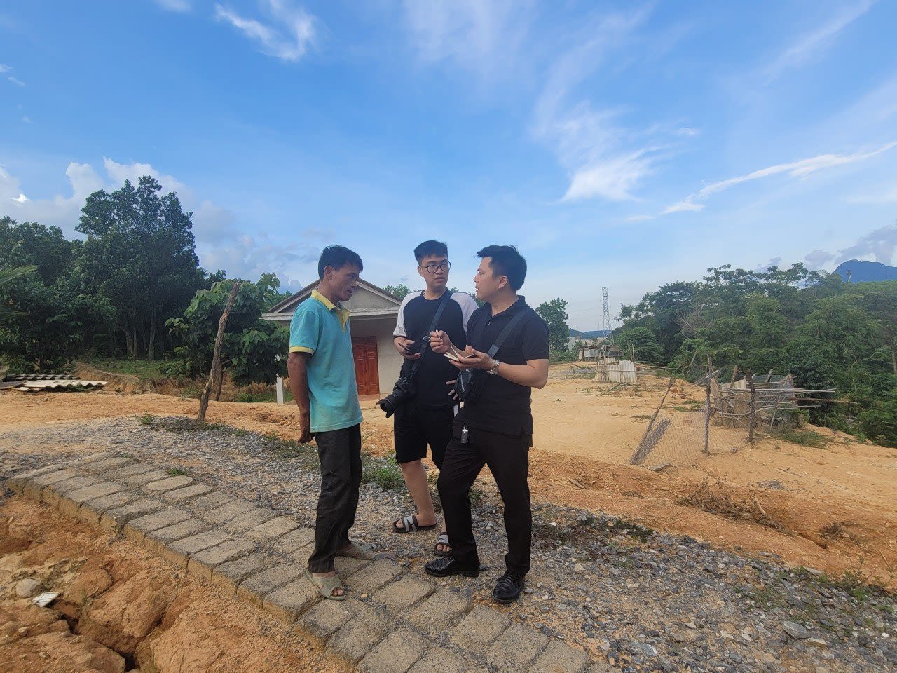 Nhà báo Võ Mạnh Hùng (áo đen bên phải) và phóng viên Nguyễn Hoài Nam tác nghiệp tại tỉnh Quảng Trị.