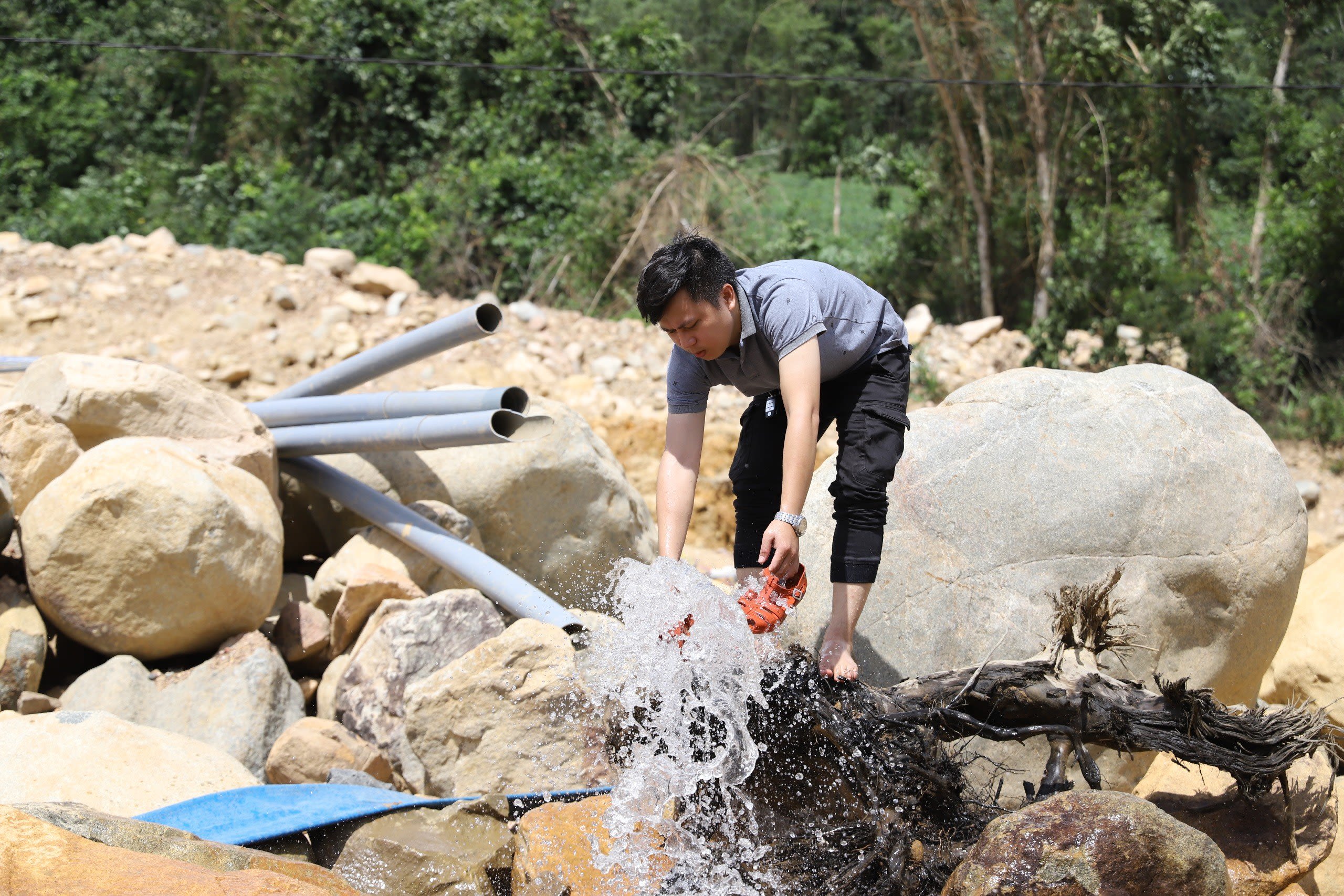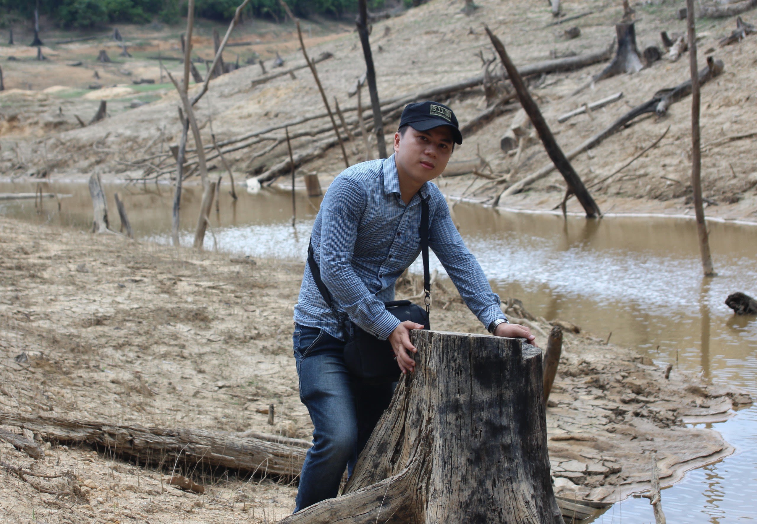 Nhà báo Võ Mạnh HÙng trong chuyến tác nghiệp tìm hiểu về tình trạng hồ thủy điện "nuốt" rừng tại tỉnh Quảng Nam.