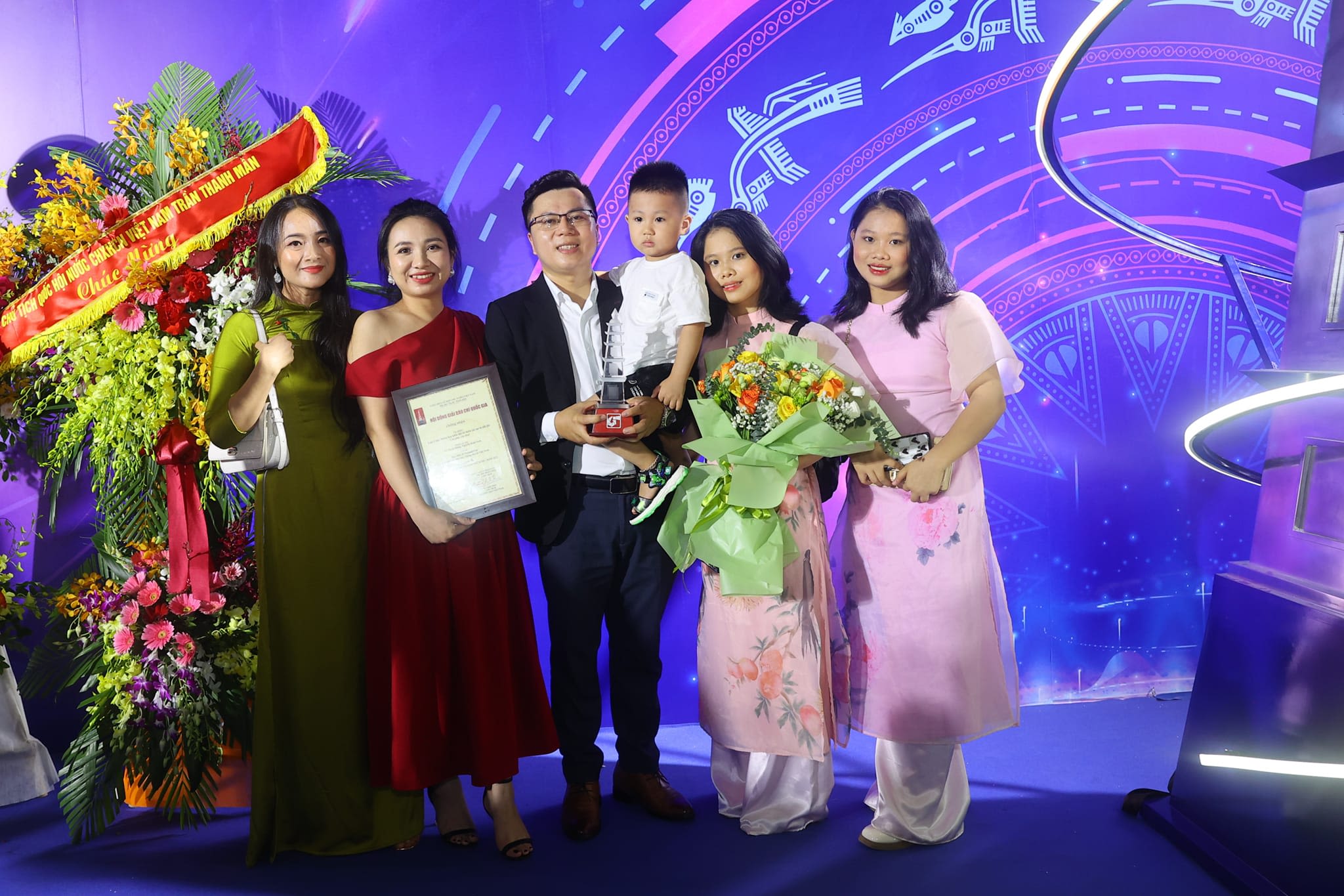 Nhà báo Võ Mạnh Hùng cùng vợ, con trai và người thân tại Lễ trao Giải Báo chí Quốc gia năm 2023.