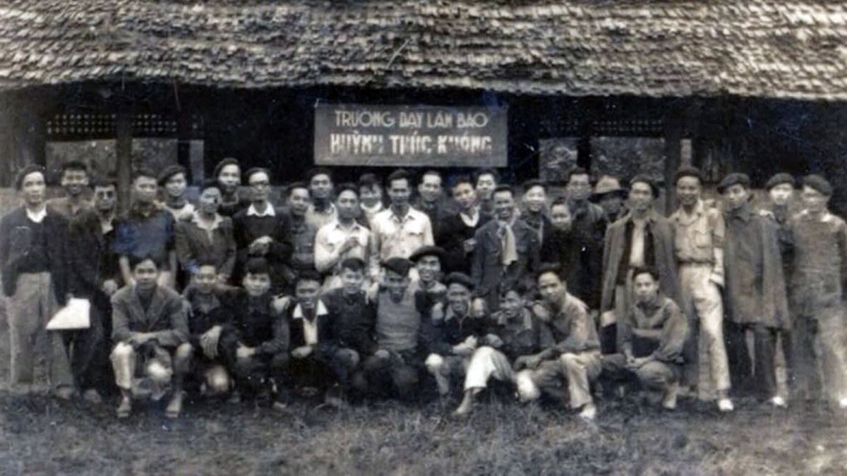 Chủ nhiệm Xuân Thủy (quàng khăn) cùng các đồng nghiệp báo Cứu Quốc tại đèo Bụt, Bắc Giang, năm 1948.