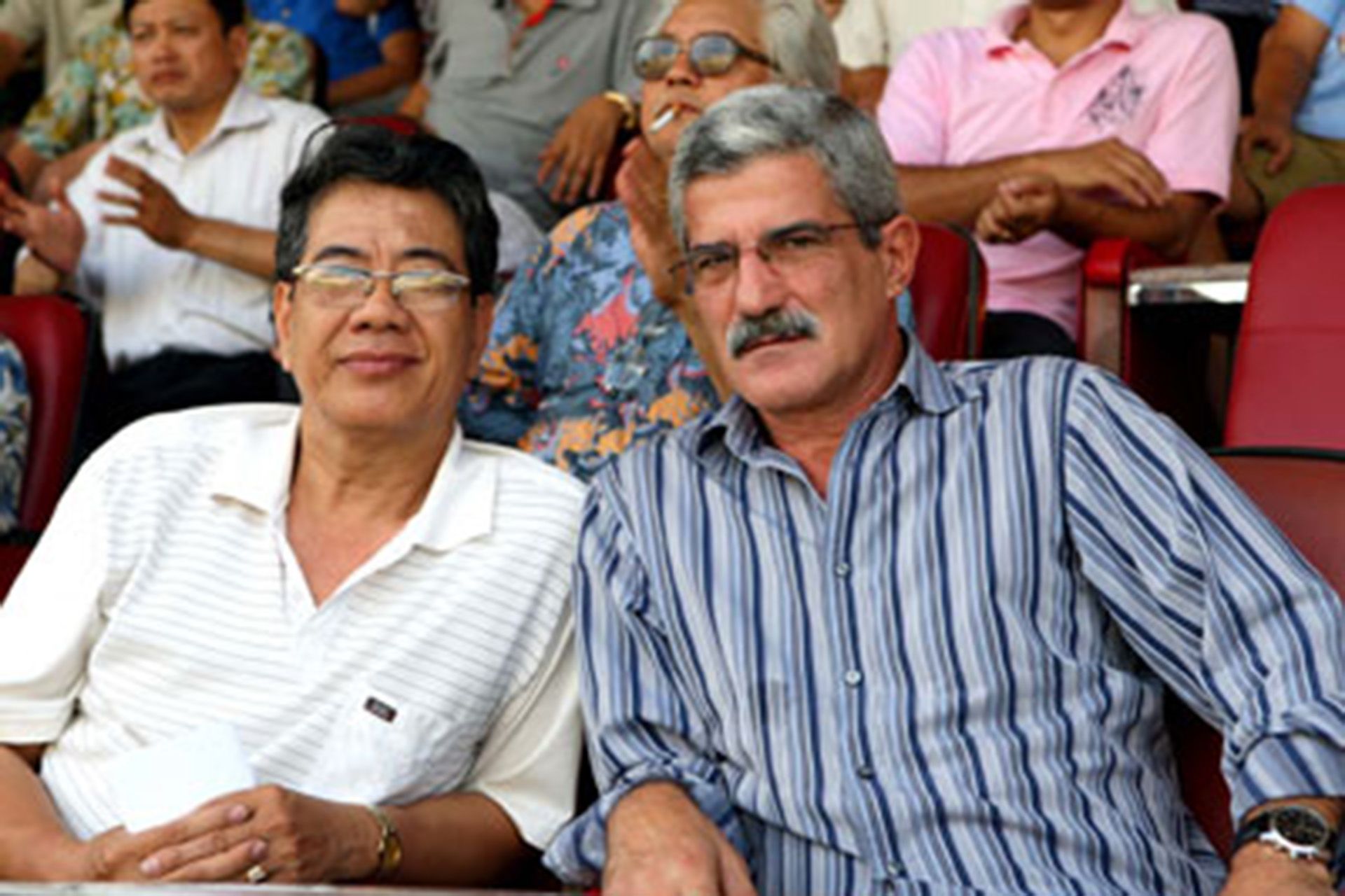 Nhà báo Nguyễn Lưu khi cùng cựu huấn luyện viên Henrique Calisto trong một trận đấu tại V-League.