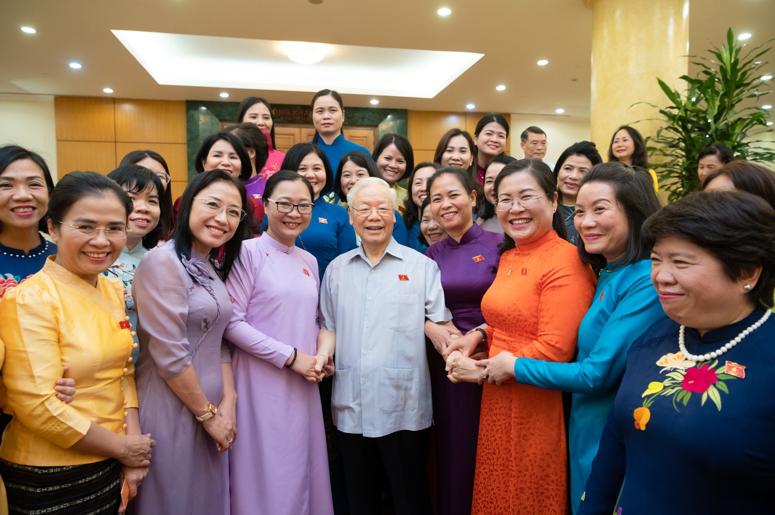 Tổng Bí thư Nguyễn Phú Trọng trong buổi gặp mặt các nữ đại biểu Quốc hội khóa XV. (Ảnh: quochoi.vn)