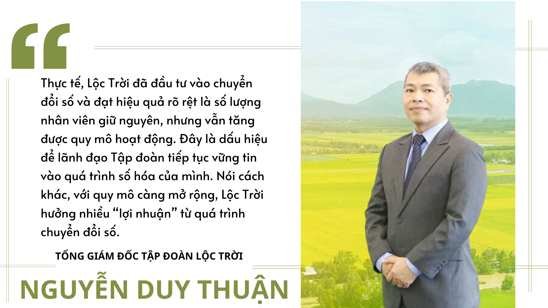 Tổng Giám đốc Tập đoàn Nguyễn Duy Thuận cho biết, “VĂN PHÒNG KHÔNG GIẤY”, “ĐỒNG RUỘNG KHÔNG DẤU CHÂN” và “THANH TOÁN KHÔNG TIỀN MẶT” là 3 kết quả ban đầu từ việc Lộc Trời ứng dụng số hóa.