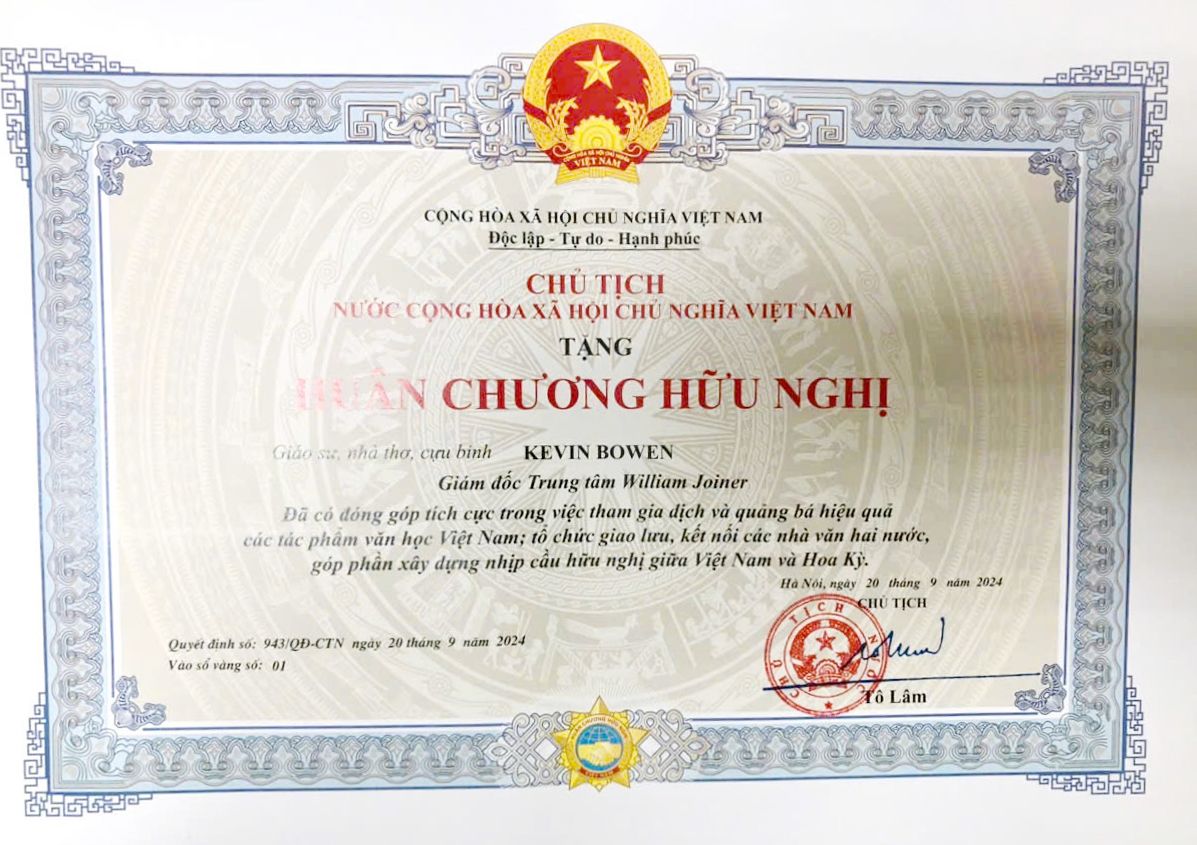Với những cống hiến không mệt mỏi của hai giáo sư, nhà thơ cựu binh Mỹ trong gần 40 năm qua, ngày 20/9/2024, Chủ tịch nước Cộng hòa xã hội chủ nghĩa Việt Nam Tô Lâm đã ký quyết định số 943/QĐ-CTN tặng Kevin Bowen và Bruce Weigl Huân chương Hữu nghị vì “đã có những đóng góp tích cực trong việc tham gia dịch và quảng bá hiệu quả các tác phẩm văn học Việt Nam; tổ chức giao lưu, kết nối các nhà văn hai nước, góp phần xây dựng nhịp cầu hữu nghị giữa Việt Nam và Hoa Kỳ”.