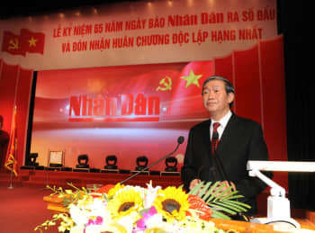 Đồng chí Đinh Thế Huynh cùng lãnh đạo, phóng viên, biên tập viên tại lễ kỷ niệm 65 năm Ngày Báo Nhân Dân ra số đầu và đón nhận Huân chương Độc lập hạng nhất. (Ảnh: TRẦN HẢI)