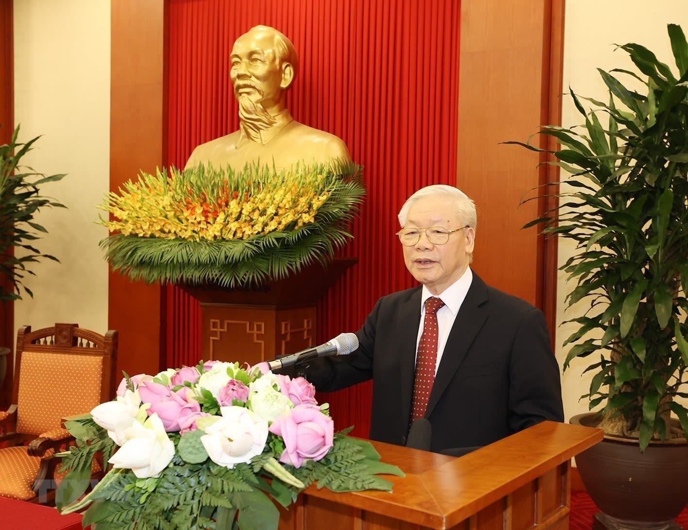 Tổng Bí thư Nguyễn Phú Trọng phát biểu tại buổi gặp mặt thân mật các đại biểu về dự Đại hội đại biểu toàn quốc Hội Chữ thập đỏ Việt Nam lần thứ XI, nhiệm kỳ 2022- 2027. (Ảnh TTXVN)