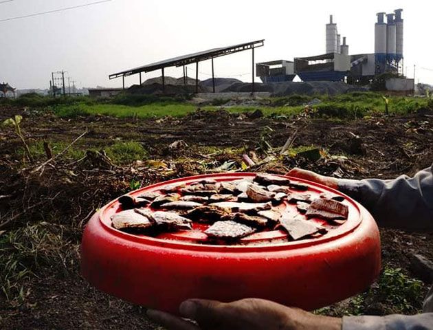 Những mảnh di vật phát lộ khi xe công trình đào ủi nền đường. (Ảnh: người dân cung cấp)