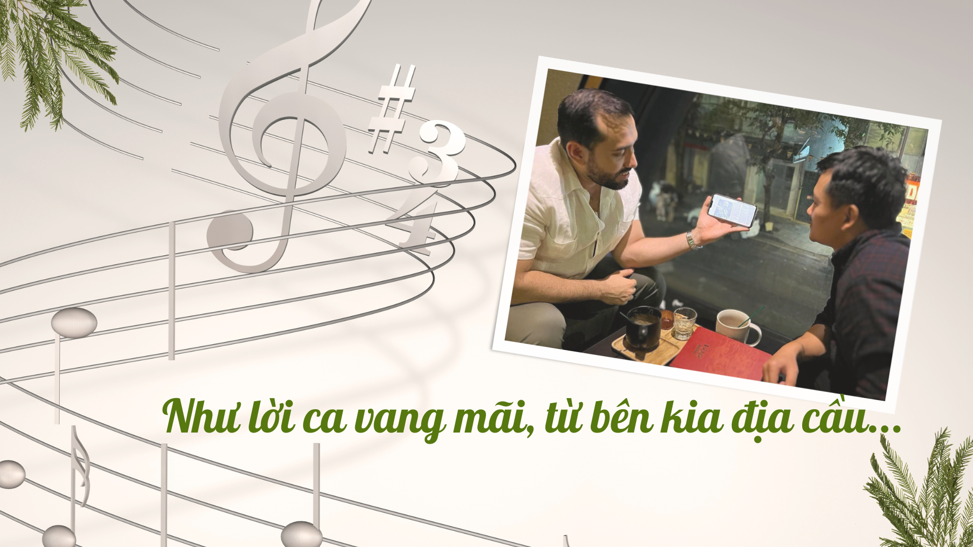 Tạm dừng cuộc trò chuyện, Đại sứ bất chợt rút điện thoại ra, mở ca khúc "Quyền được sống trong hòa bình", rồi lắc lư theo giai điệu, miệng ngân nga: "Bác Hồ/Là bài ca của chúng ta. Là ngọn lửa tình yêu trong sáng/ Là chim bồ câu trắng. Là cành ô-liu/ Là tiếng hát của toàn thế giới/ Là chìa khóa mở ra chiến thắng cho quyền sống hòa bình". Đột nhiên, cả góc quán cà-phê rộn ràng "khí thế" hẳn lên.