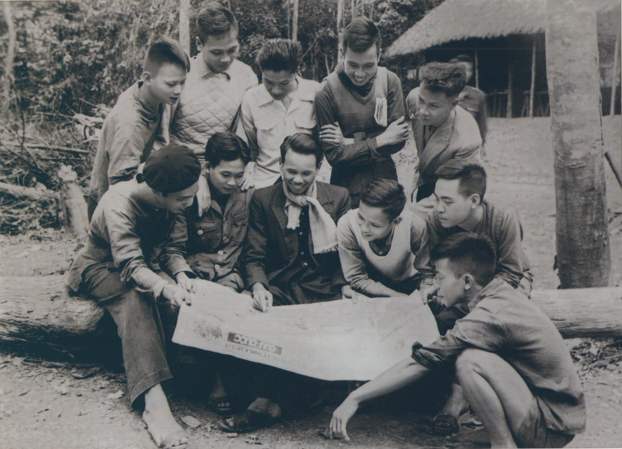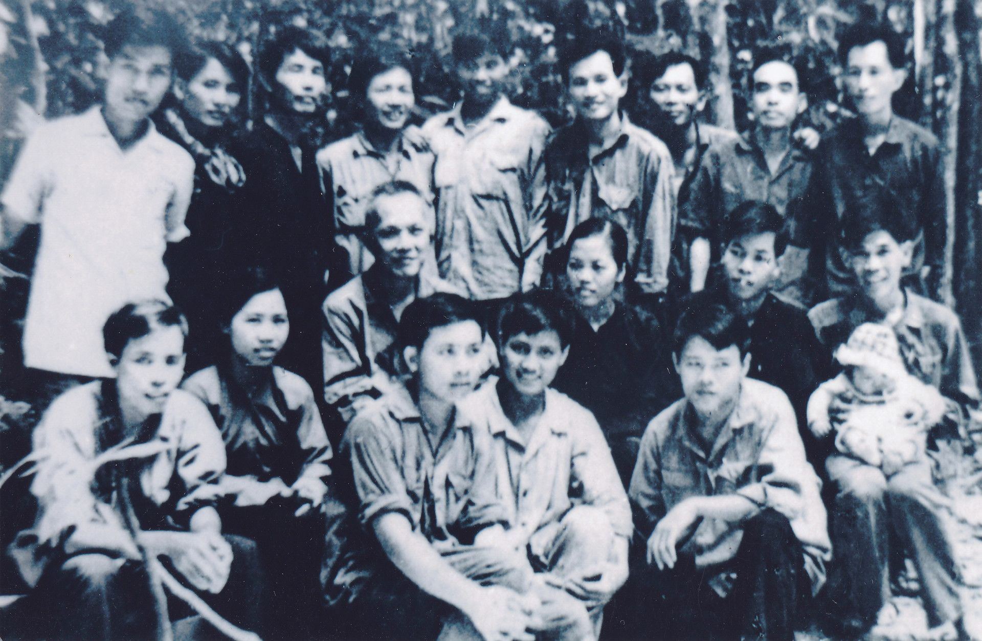 Nhà báo Thái Duy (ngồi ngoài cùng bên phải, hàng thứ hai) cùng lãnh đạo, phóng viên báo Cứu Quốc tại đèo Bụt, Bắc Giang, năm 1949.