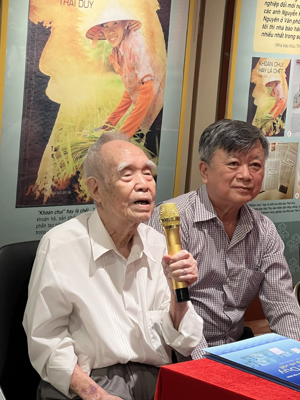 Nhà báo Thái Duy trò chuyện với đồng nghiệp (năm 2023).