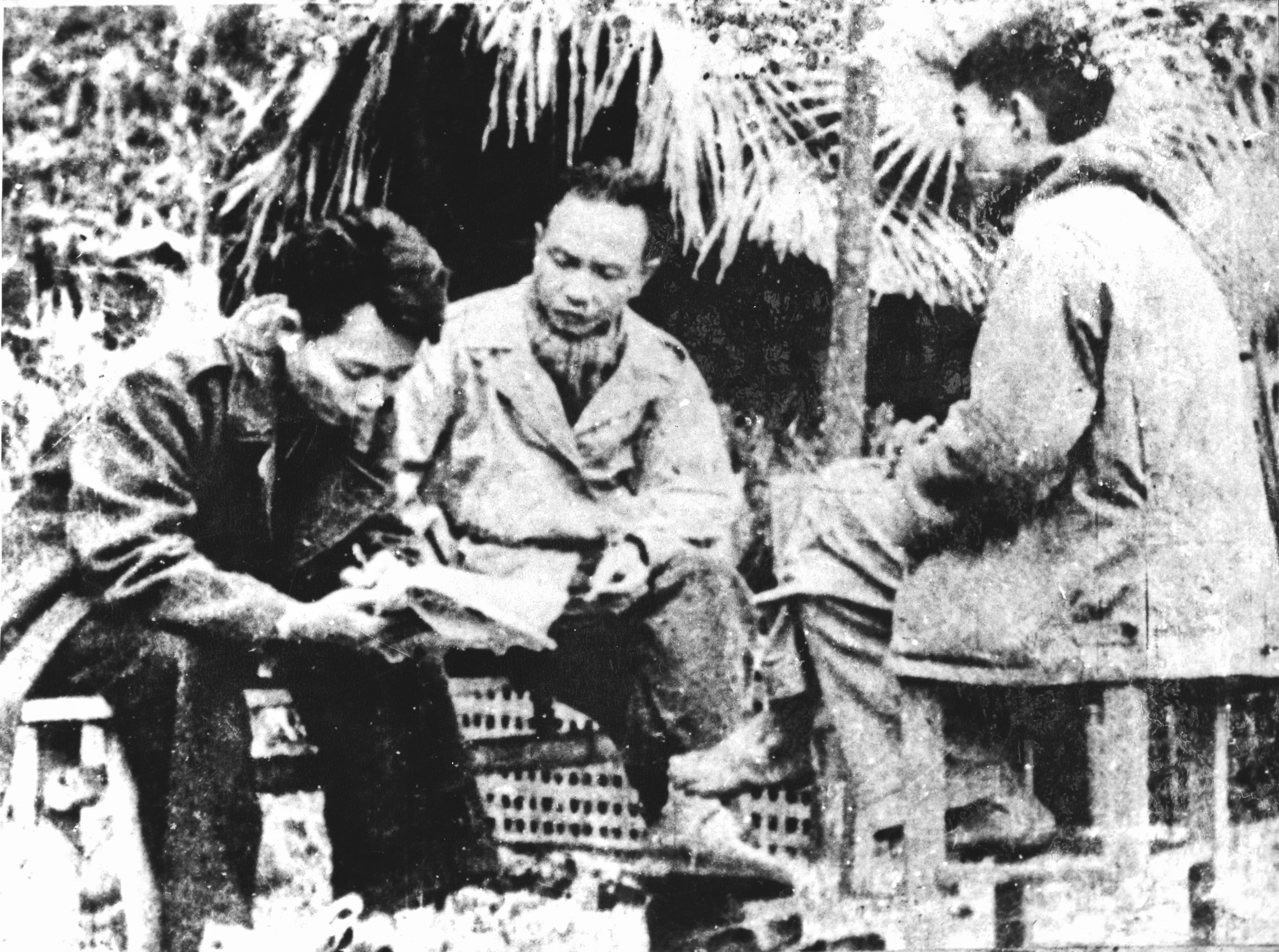 Đồng chí Trường Chinh, Thép Mới và Hà Xuân Trường duyệt bản thảo đăng Báo Nhân Dân số đầu tiên năm 1951. (Ảnh tư liệu)