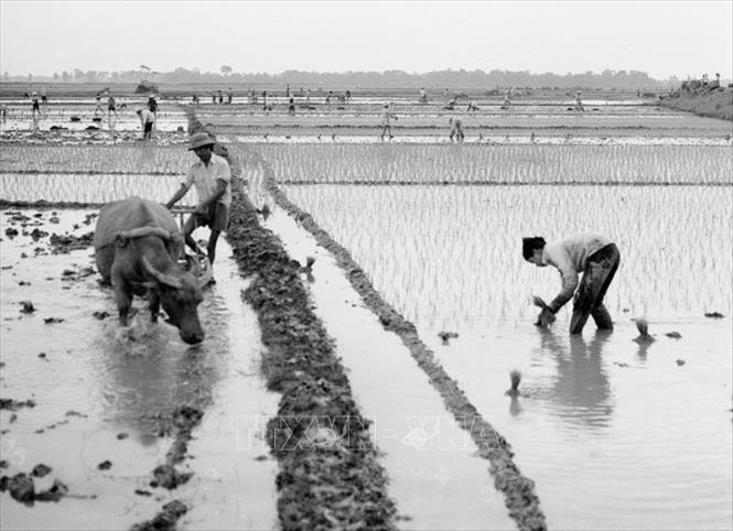 Xã viên HTX Đan Phượng (huyện Đan Phượng, Hà Nội) cấy lúa mùa trên ruộng nhận Khoán 10 mùa vụ 1989. Ảnh: TTXVN