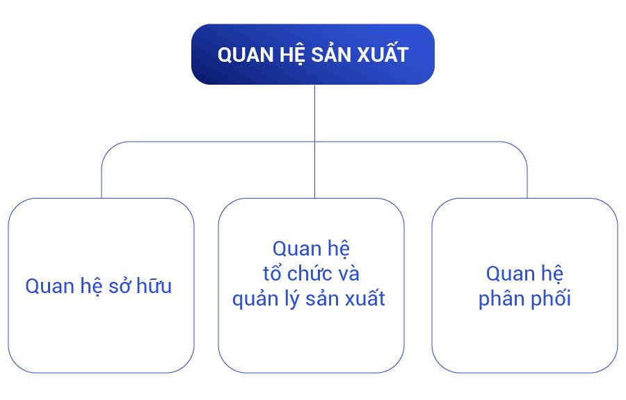 Quan hệ sản xuất gồm ba mối quan hệ chính: Một là, quan hệ về sở hữu; hai là quan hệ về tổ chức và quản lý sản xuất; ba là quan hệ về phân phối.