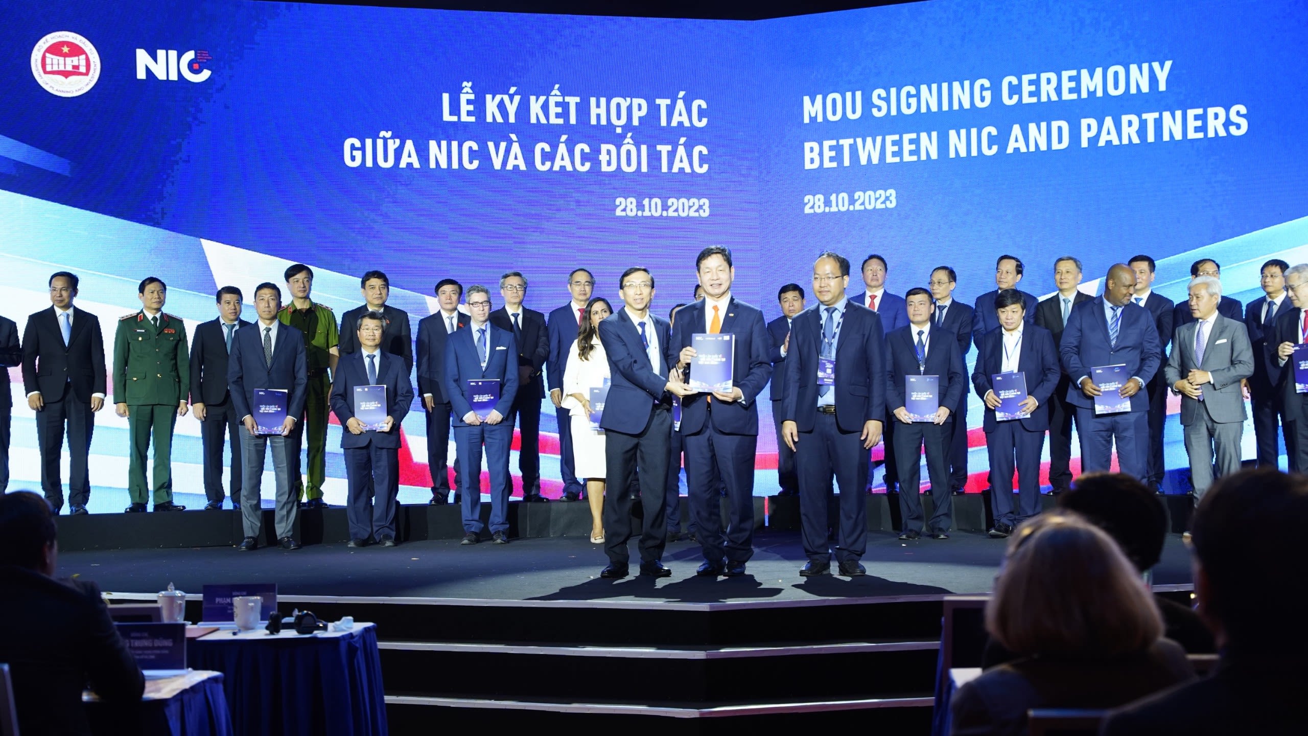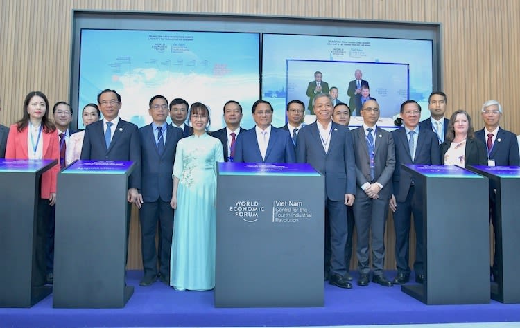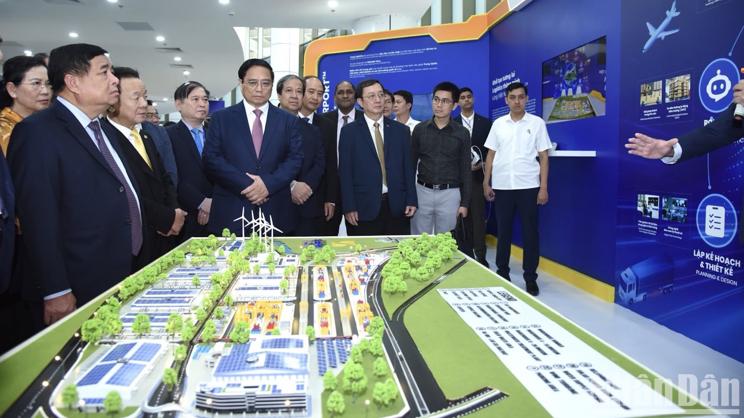 Thủ tướng Phạm Minh Chính và các đồng chí lãnh đạo, các doanh nghiệp tại Lễ khánh thành Trung tâm Cách mạng công nghiệp 4.0 (C4IR) Thành phố Hồ Chí Minh. (Ảnh: Thanh Giang)