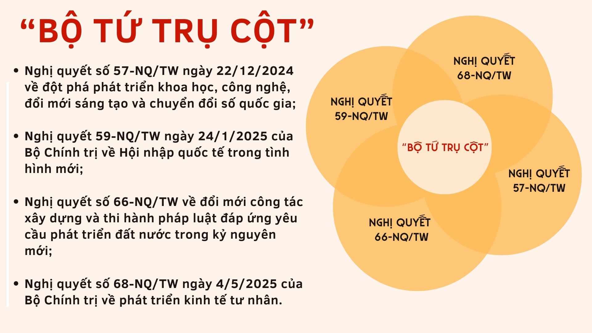 “Bộ tứ trụ cột”, gồm: Nghị quyết số 57-NQ/TW ngày 22/12/2024 của Bộ Chính trị về đột phá phát triển khoa học, công nghệ, đổi mới sáng tạo và chuyển đổi số quốc gia; Nghị quyết 59-NQ/TW ngày 24/1/2025 của Bộ Chính trị về Hội nhập quốc tế trong tình hình mới; Nghị quyết số 66-NQ/TW về đổi mới công tác xây dựng và thi hành pháp luật đáp ứng yêu cầu phát triển đất nước trong kỷ nguyên mới; Nghị quyết số 68-NQ/TW ngày 4/5/2025 của Bộ Chính trị về phát triển kinh tế tư nhân.