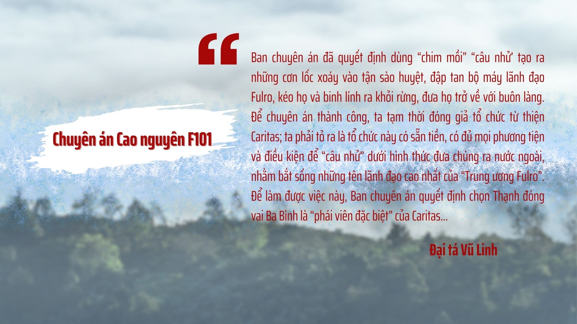 Ông nói: “Ban chuyên án đã quyết định dùng “chim mồi” “câu nhử’ tạo ra những cơn lốc xoáy vào tận sào huyệt, đập tan bộ máy lãnh đạo Fulro, kéo họ và binh lính ra khỏi rừng, đưa họ trở về với buôn làng. Để chuyên án thành công, ta tạm thời đóng giả tổ chức từ thiện Caritas; ta phải tỏ ra là tổ chức này có sẵn tiền, có đủ mọi phương tiện và điều kiện để “câu nhử” dưới hình thức đưa chúng ra nước ngoài, nhằm bắt sống những tên lãnh đạo cao nhất của “Trung ương Fulro”. Để làm được việc này, Ban chuyên án quyết định chọn Thạnh đóng vai Ba Bình là “phái viên đặc biệt” của Caritas…”