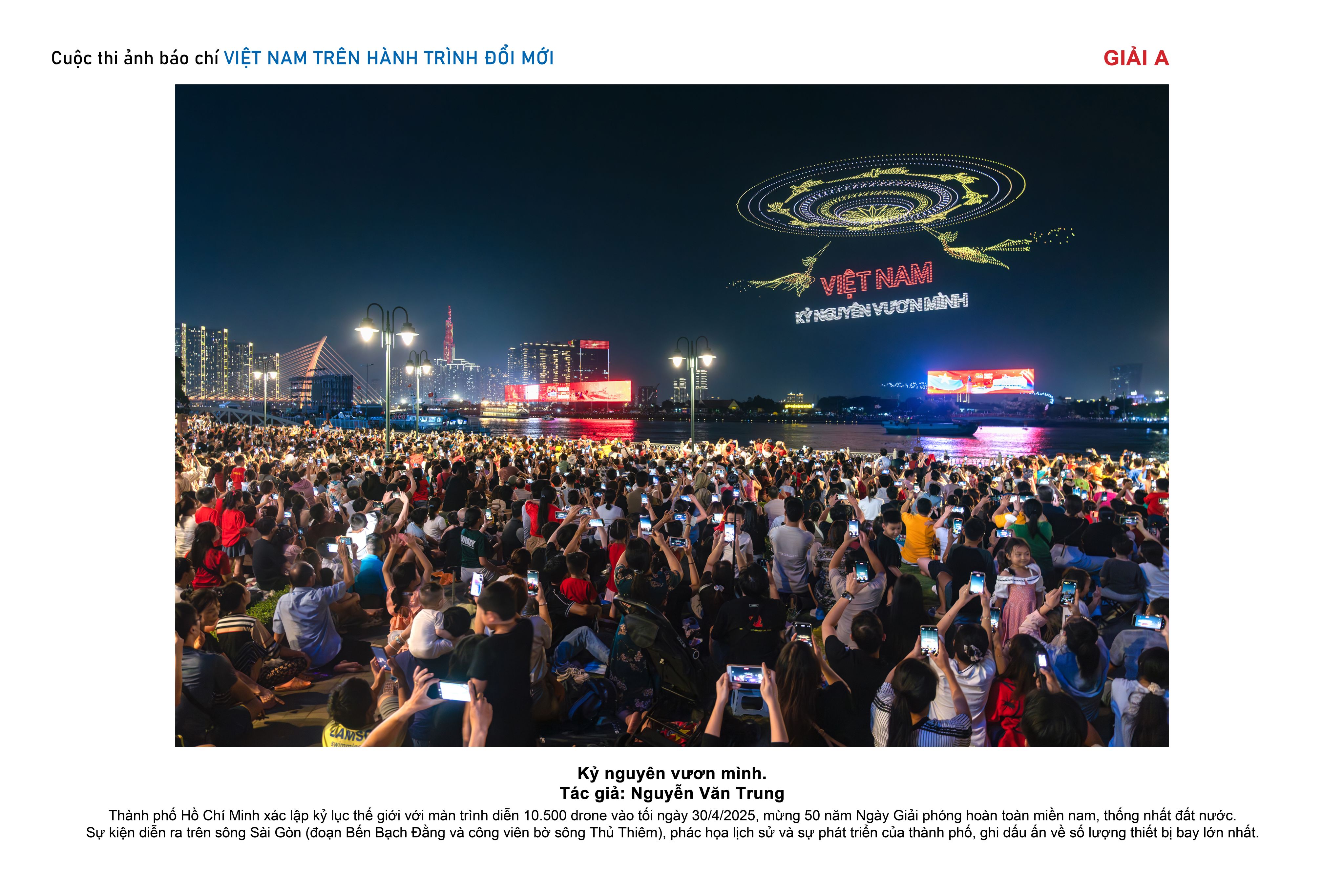 Trong số các tác phẩm đoạt giải, tác phẩm “Kỷ nguyên vươn mình” của nhiếp ảnh gia trẻ Nguyễn Văn Trung gây ấn tượng mạnh khi ghi lại khoảnh khắc hàng nghìn người dân cùng giơ điện thoại ghi lại màn trình diễn drone trên bầu trời Thành phố Hồ Chí Minh.