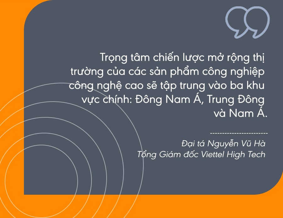 "Trọng tâm chiến lược mở rộng thị trường của các sản phẩm công nghiệp công nghệ cao sẽ tập trung vào ba khu vực chính: Đông Nam Á, Trung Đông và Nam Á", Đại tá Nguyễn Vũ Hà, Tổng Giám đốc Viettel High Tech – đơn vị chủ lực của Viettel về công nghiệp công nghệ cao, nhấn mạnh.
