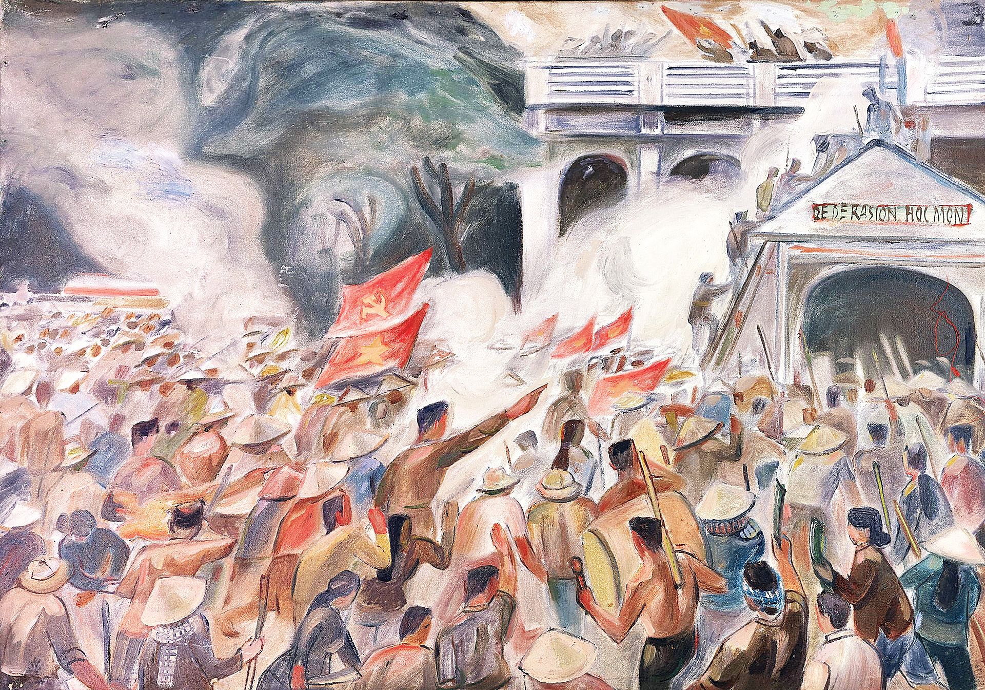 1Trong Bảo tàng Lịch sử quốc gia, tại phần trưng bày về thời kỳ trước Cách mạng Tháng Tám, có phiên bản bức tranh sơn dầu, vẽ lại một cảnh Khởi nghĩa Nam Kỳ diễn ra ở Hóc Môn (thuộc Thành phố Hồ Chí Minh hôm nay). Bức tranh miêu tả từ phía sau một đoàn người như sóng cuộn đang tiến công một khu đồn trú của Pháp, từ cổng chính, trèo thang thẳng lên tầng hai của tòa nhà. Bay phấp phới phía trên đoàn người là rất nhiều lá cờ đỏ búa liềm và cờ đỏ sao vàng năm cánh.