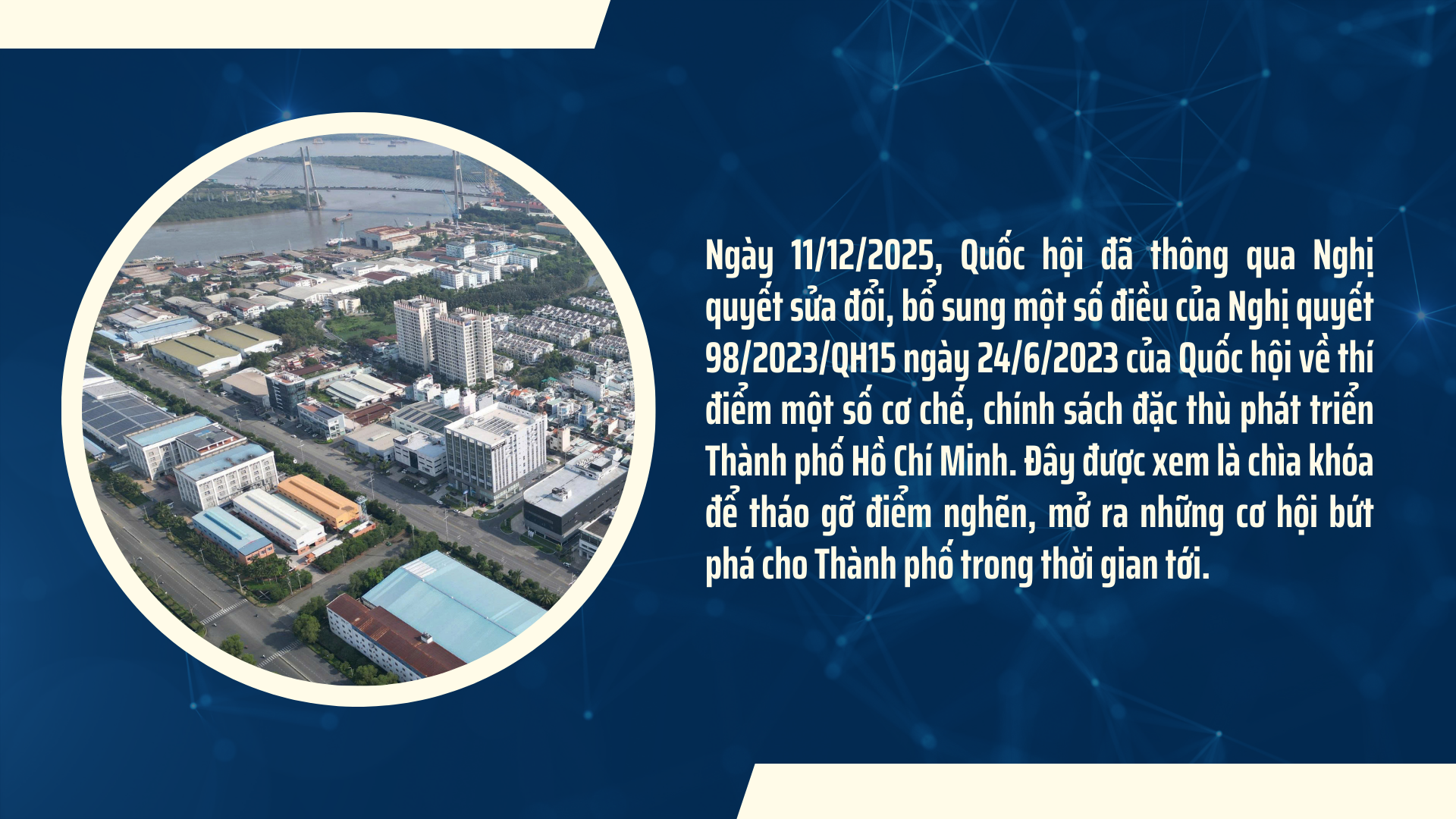 Quốc hội thông qua Nghị quyết sửa đổi, bổ sung một số điều của Nghị quyết số 98/2023/QH15 ngày 11/12/2025 là kết quả của quá trình tổng kết thực tiễn triển khai cơ chế đặc thù đối với Thành phố Hồ Chí Minh trong hơn hai năm qua. Thực tiễn cho thấy, trong bối cảnh Thành phố đã bước sang giai đoạn phát triển mới sau hợp nhất, quy mô dân số và không gian kinh tế–đô thị gia tăng nhanh, nhiều cơ chế của Nghị quyết 98/2023/QH15 đã bộc lộ giới hạn, chưa theo kịp yêu cầu phát triển của một siêu đô thị đang định hình vai trò trung tâm kinh tế, tài chính, khoa học–công nghệ của khu vực.