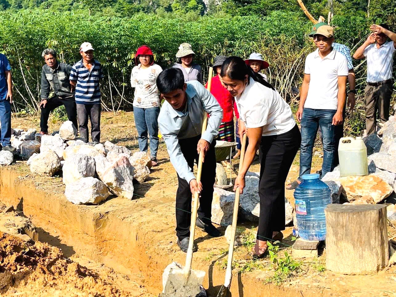 Chị Hồ Thị Nhanh cùng lãnh đạo xã Ngân Thủy khởi công xây Nhà Đại đoàn kết cho hộ gia đình có hoàn cảnh khó khăn.