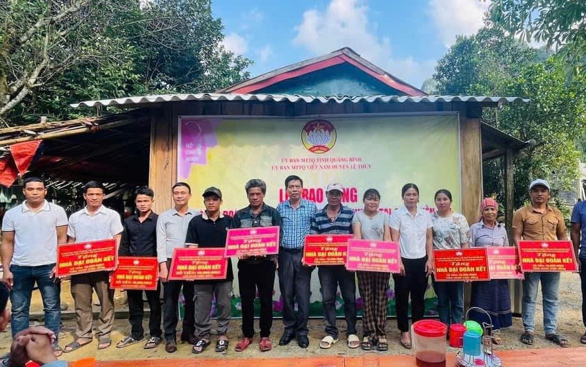 Chị Hồ Thị Nhanh trao biển tượng trưng cho các hộ được hỗ trợ xây Nhà Đại đoàn kết trong xã.