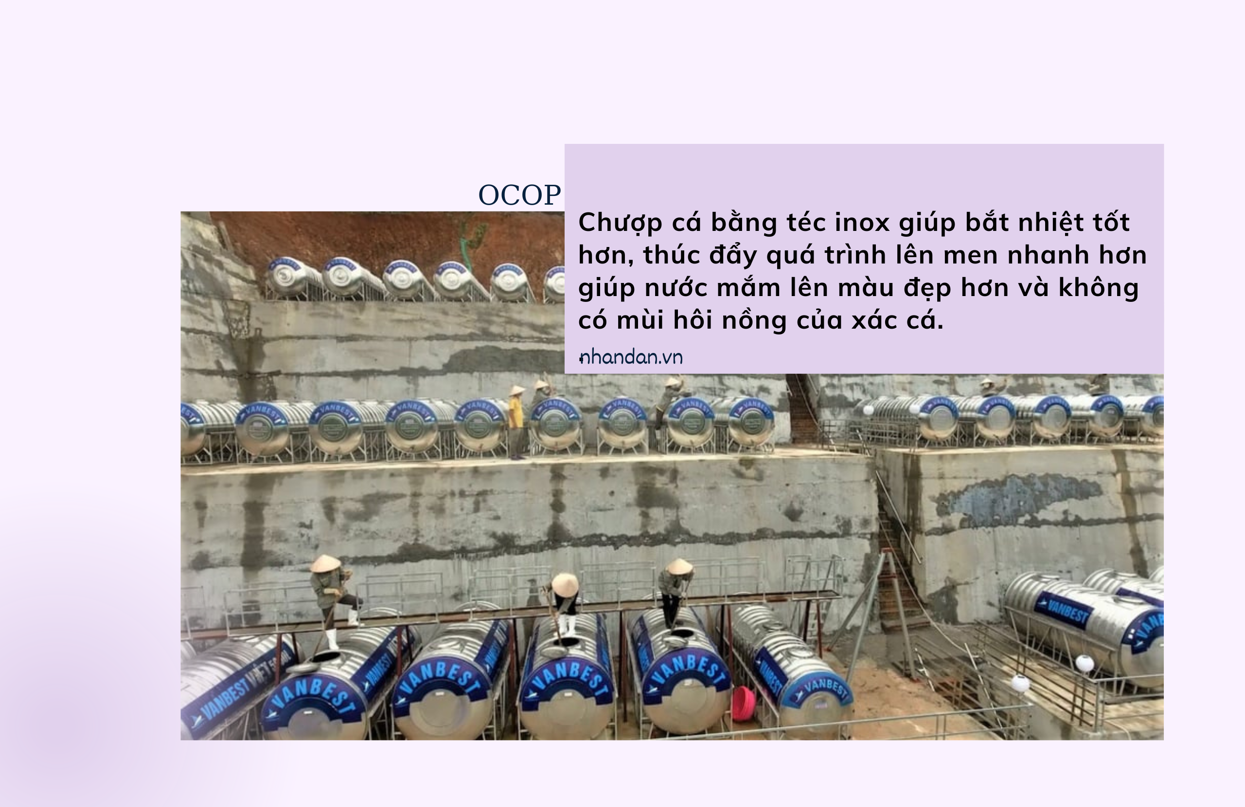 “Bình thường người ta muối cá bằng thùng gỗ hoặc chum sành nhưng tôi chượp cá trong téc 316, mỗi téc chứa được 5 tấn cá, ủ cá muối trong téc giúp bắt nhiệt tốt hơn, thúc đẩy quá trình lên men nhanh hơn giúp nước mắm lên màu đẹp hơn và không có mùi hôi nồng của xác cá. So với cách muối truyền thống quá trình lên men rút ngắn hơn 1-2 tháng. Hiện nay, Vanbest là đơn vị duy nhất sản xuất nước mắm theo công nghệ này vì quá trình sử dụng đòi hỏi trình độ chuyên môn và bí kíp riêng biệt vì độ mặn và axit rất dễ phá hủy téc”, nữ giám đốc say sưa kể về thành quả sau chặng đường dài nghiên cứu.