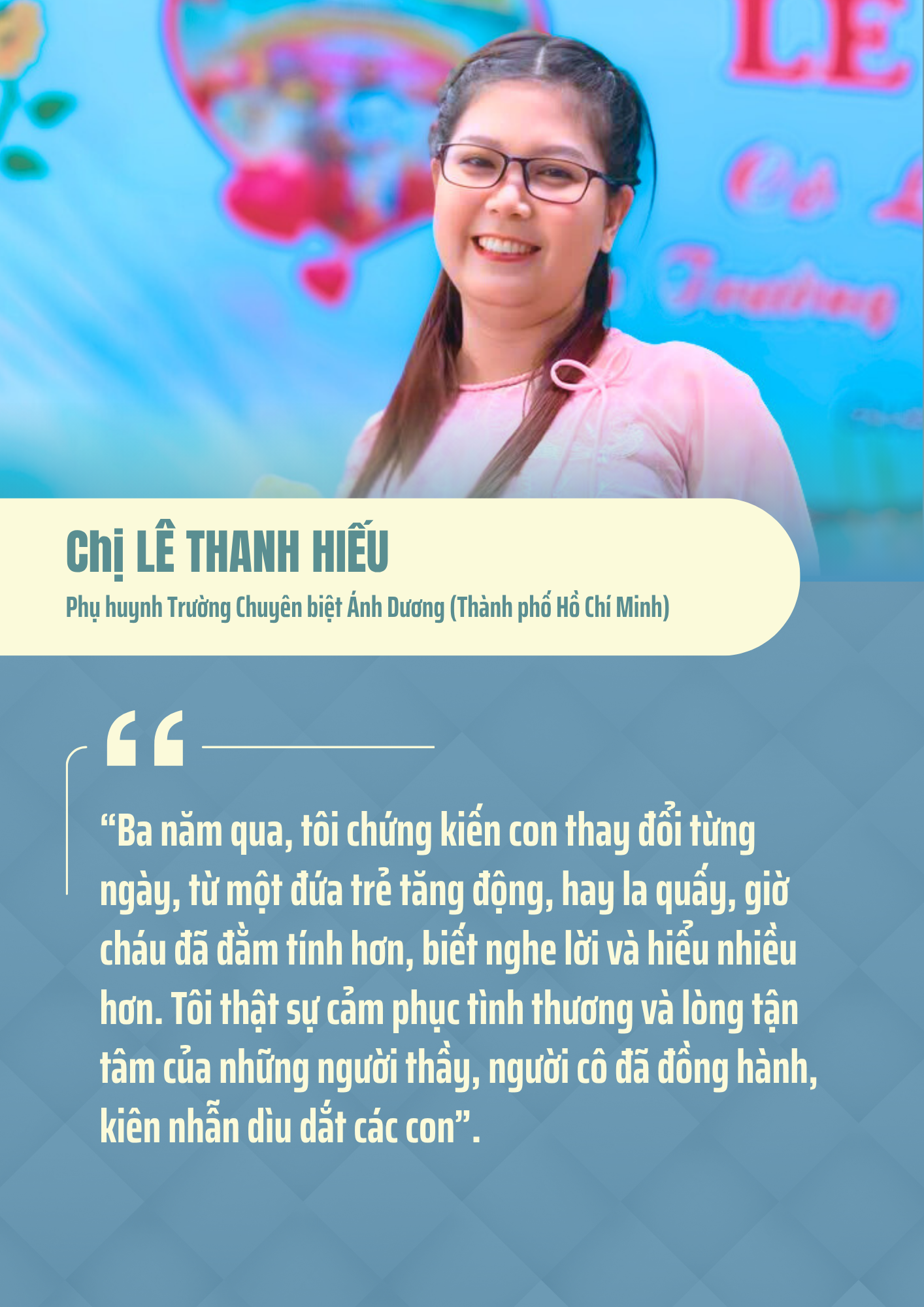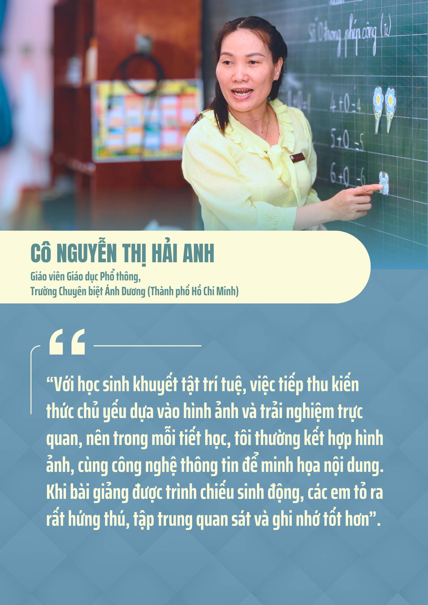 Những nỗ lực bền bỉ của đội ngũ giáo viên tại các cơ sở giáo dục chuyên biệt ở Thành phố Hồ Chí Minh, không chỉ giúp học sinh khuyết tật được học tập, mà còn mở ra cơ hội phát triển và hòa nhập cộng đồng. Với các thầy cô dạy ở những ngôi trường đặc biệt này, sau mỗi năm học, thành quả lớn nhất không nằm ở điểm số hay thành tích thi đua, mà ở những bước tiến, dẫu nhỏ của từng học sinh.