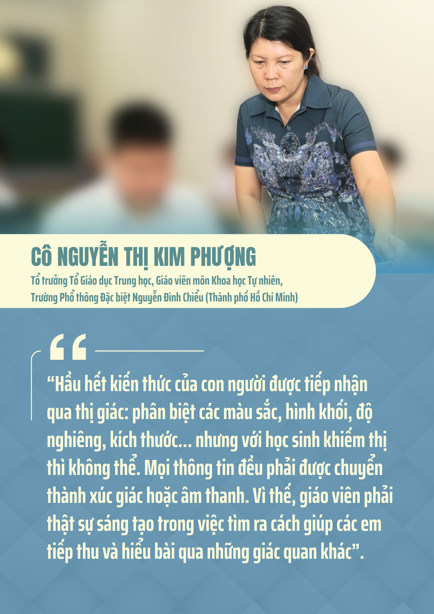 Khác với các bạn khuyết tật trí tuệ, cái khó của học sinh khiếm thị lại là không thể học bằng thị giác. Với môn học Khoa học Tự nhiên các thầy cô linh hoạt “chuyển ngữ” nội dung bằng hai phương pháp trọng tâm: “lời nói hóa” và “nổi hóa”.