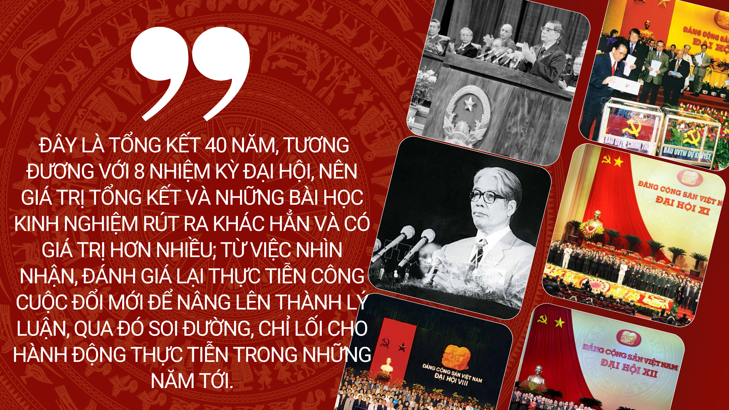 Ý nghĩa quan trọng nhất là, trên cơ sở nhìn nhận lại, đánh giá lại thực tiễn công cuộc Đổi mới, chúng ta tổng kết thực tiễn để nâng lên thành lý luận. Tổng kết một năm đã cần rút kinh nghiệm, tổng kết một nhiệm kỳ càng cần rút kinh nghiệm, nhưng đây là tổng kết 40 năm, tương đương với 8 nhiệm kỳ Đại hội, nên giá trị tổng kết và những bài học kinh nghiệm rút ra khác hẳn và có giá trị hơn nhiều. Thực tiễn cho thấy, việc tổng kết 5 năm, 10 năm chưa chắc đã được đúc kết thành lý luận, nhưng việc tổng kết thực tiễn xuyên suốt 40 năm thì những bài học kinh nghiệm rút ra thì rất có giá trị để nâng lên thành lý luận, rồi chính lý luận đó lại quay lại soi đường, chỉ lối cho hành động thực tiễn, định hướng chỉ đạo hoạt động trong những năm tới.