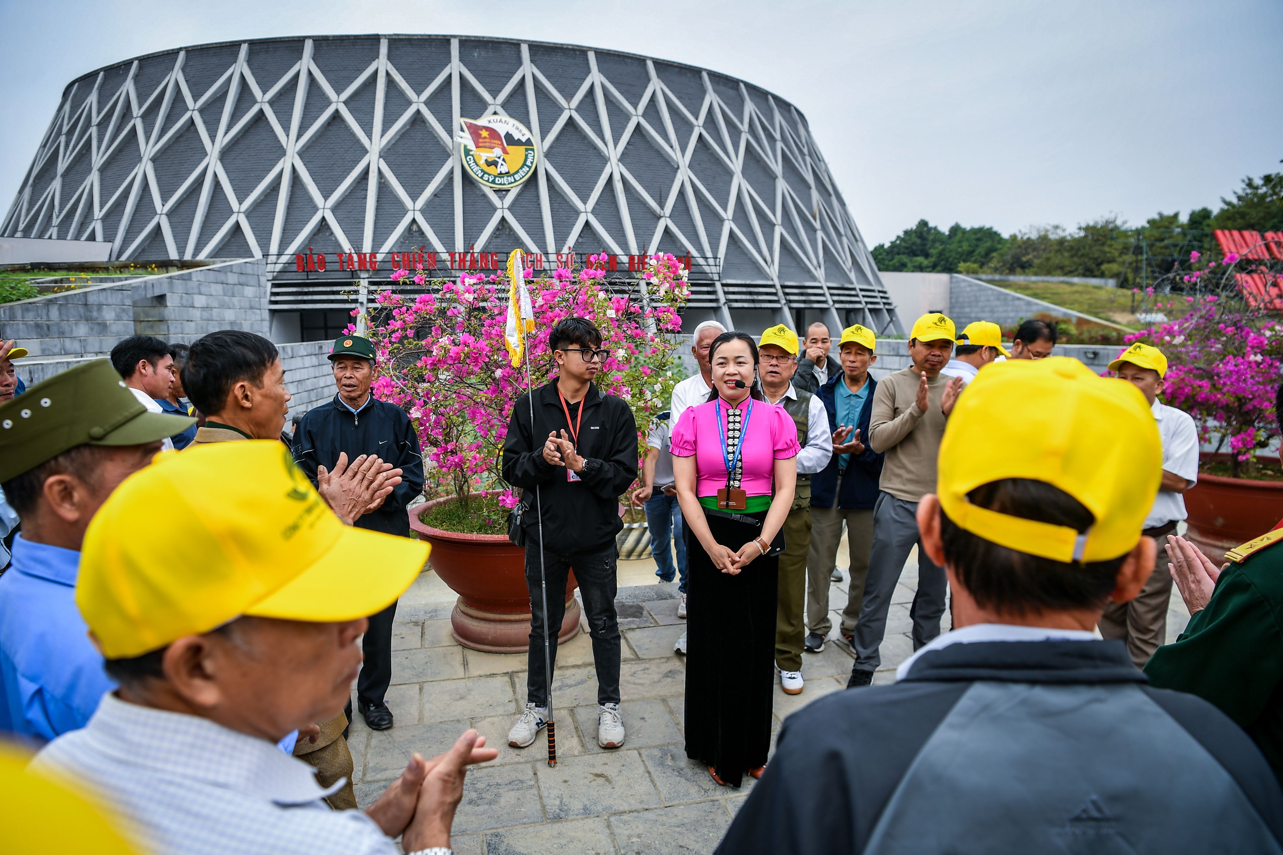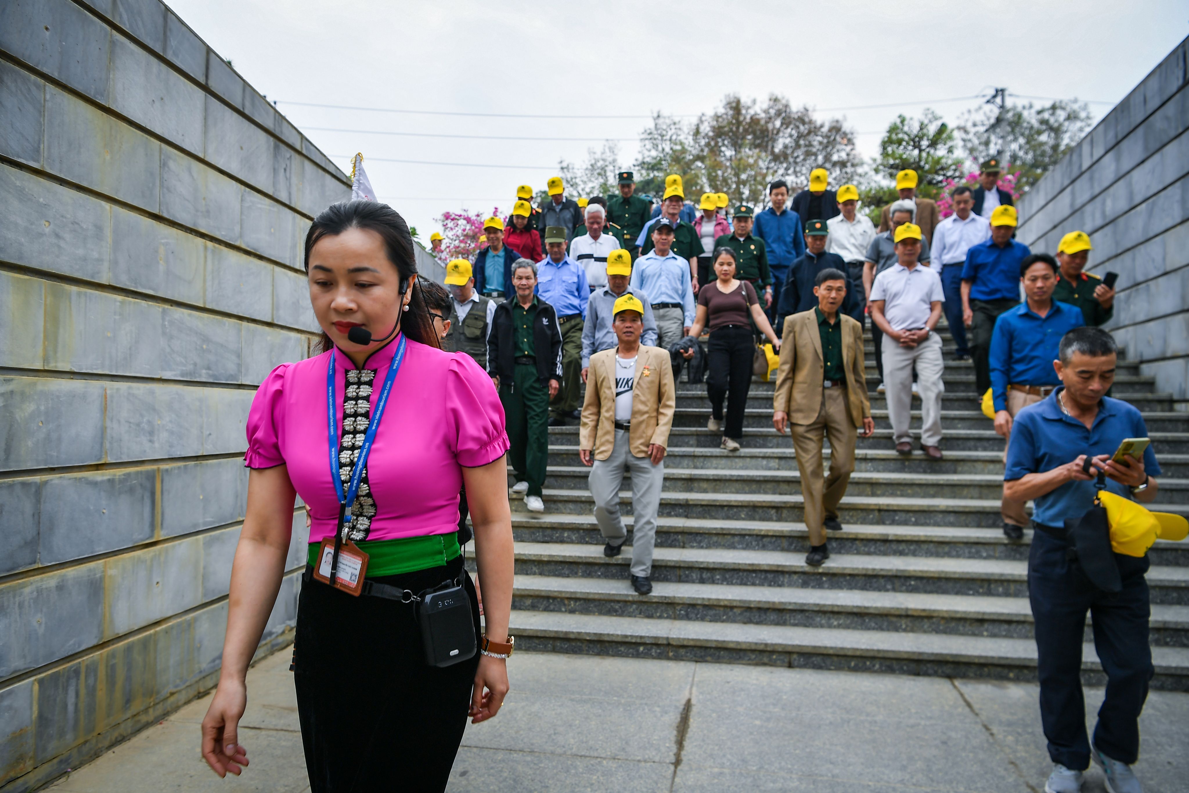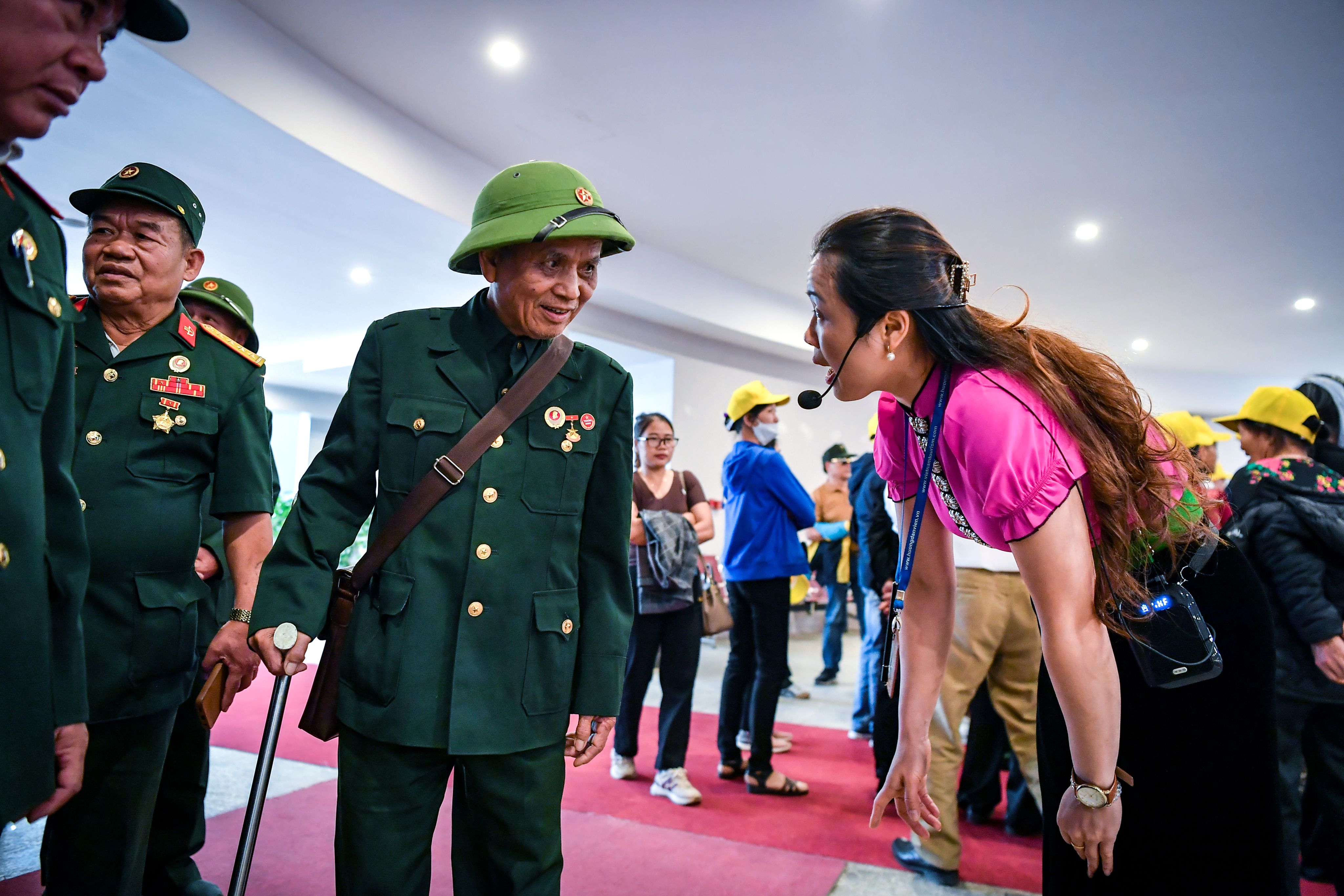 7 giờ sáng, chị Dương mở cửa Bảo tàng. Cuối tháng 4, Điện Biên vào mùa nắng gắt, hơi nóng bắt đầu ngột ngạt. Nhưng hơn 100 người đã xếp hàng chờ đợi trong sân Bảo tàng Chiến thắng Điện Biên Phủ. Màu áo lính phủ xanh màu gạch đá. Họ là những cựu chiến binh đến từ Bắc Ninh.