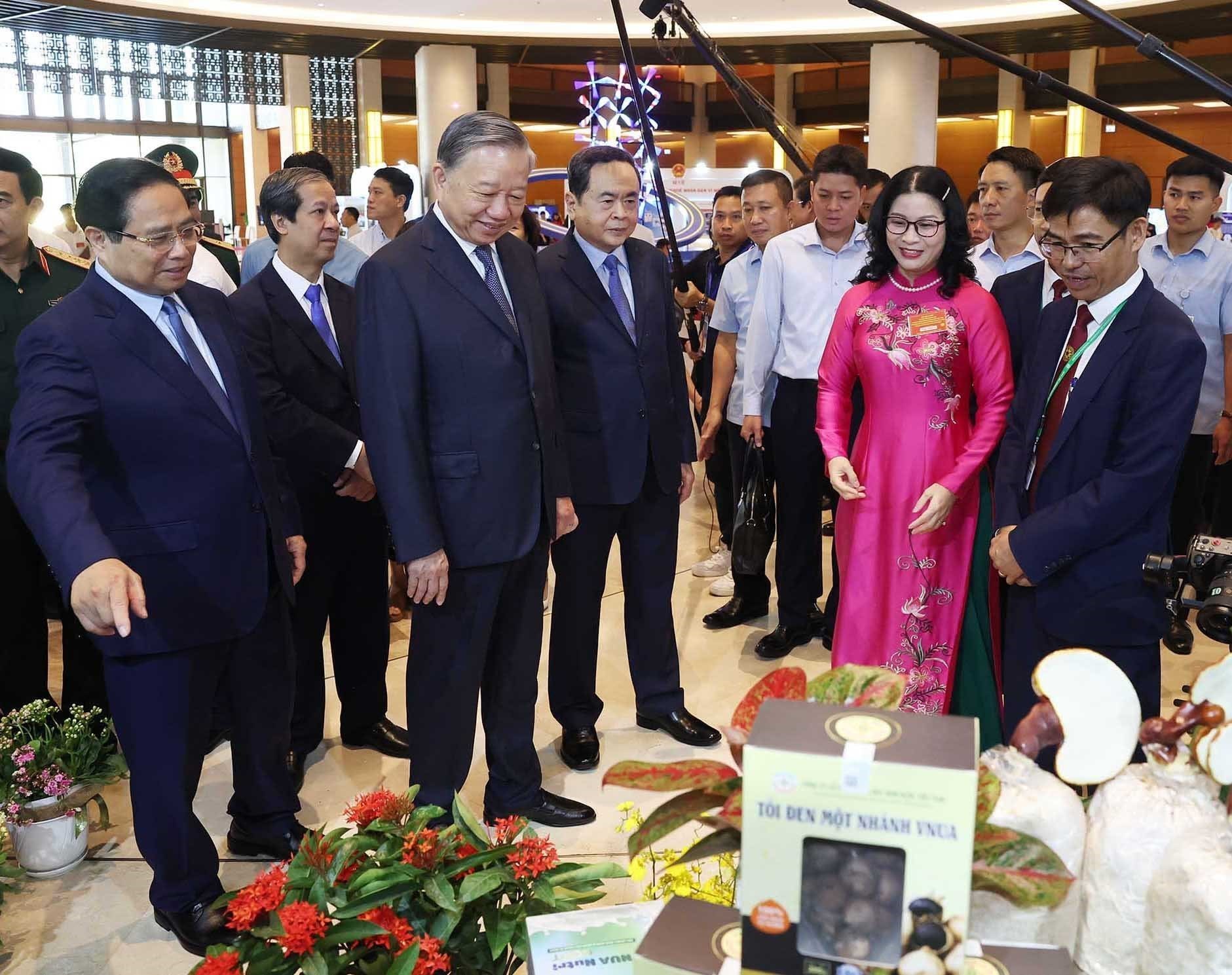 Tổng Bí thư Tô Lâm và các đồng chí Lãnh đạo Đảng, Nhà nước tham quan triển lãm “Những thành tựu nổi bật trong ngành y tế và giáo dục”. (Ảnh: TTXVN)