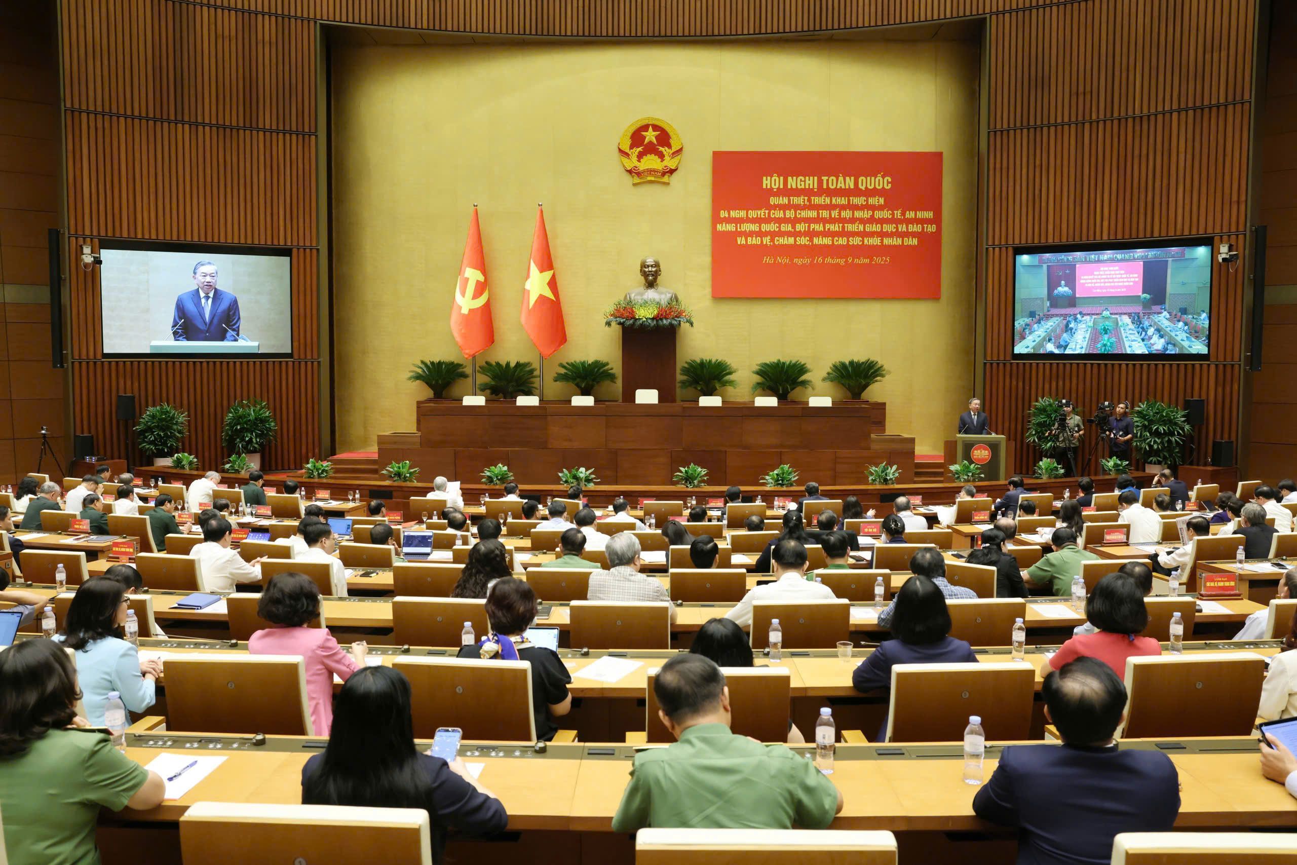 Hôm nay, Bộ Chính trị, Ban Bí thư tổ chức Hội nghị toàn quốc để quán triệt và triển khai thực hiện 4 nghị quyết hết sức quan trọng của Bộ Chính trị: Nghị quyết số 59-NQ/TW về hội nhập quốc tế trong tình hình mới; Nghị quyết số 70-NQ/TW về bảo đảm an ninh năng lượng quốc gia đến năm 2030, tầm nhìn đến năm 2045; Nghị quyết số 71-NQ/TW về đột phá phát triển giáo dục và đào tạo; Nghị quyết số 72-NQ/TW về một số giải pháp đột phá, tăng cường bảo vệ, chăm sóc sức khỏe nhân dân.