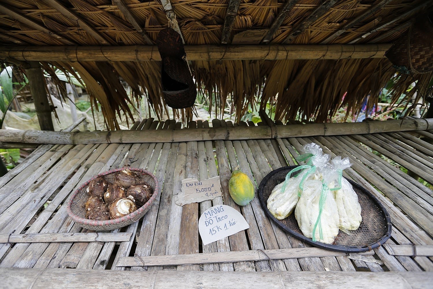 Những sản vật địa phương được bày bán tại quán tự giác - quán không có người bán tại xóm Đá Bia, xã Tiền Phong, huyện Đà Bắc. Đá Bia là bản du lịch cộng đồng đã được nhận Giải thưởng Du lịch cộng đồng ASEAN năm 2019. (Ảnh: TTXVN)