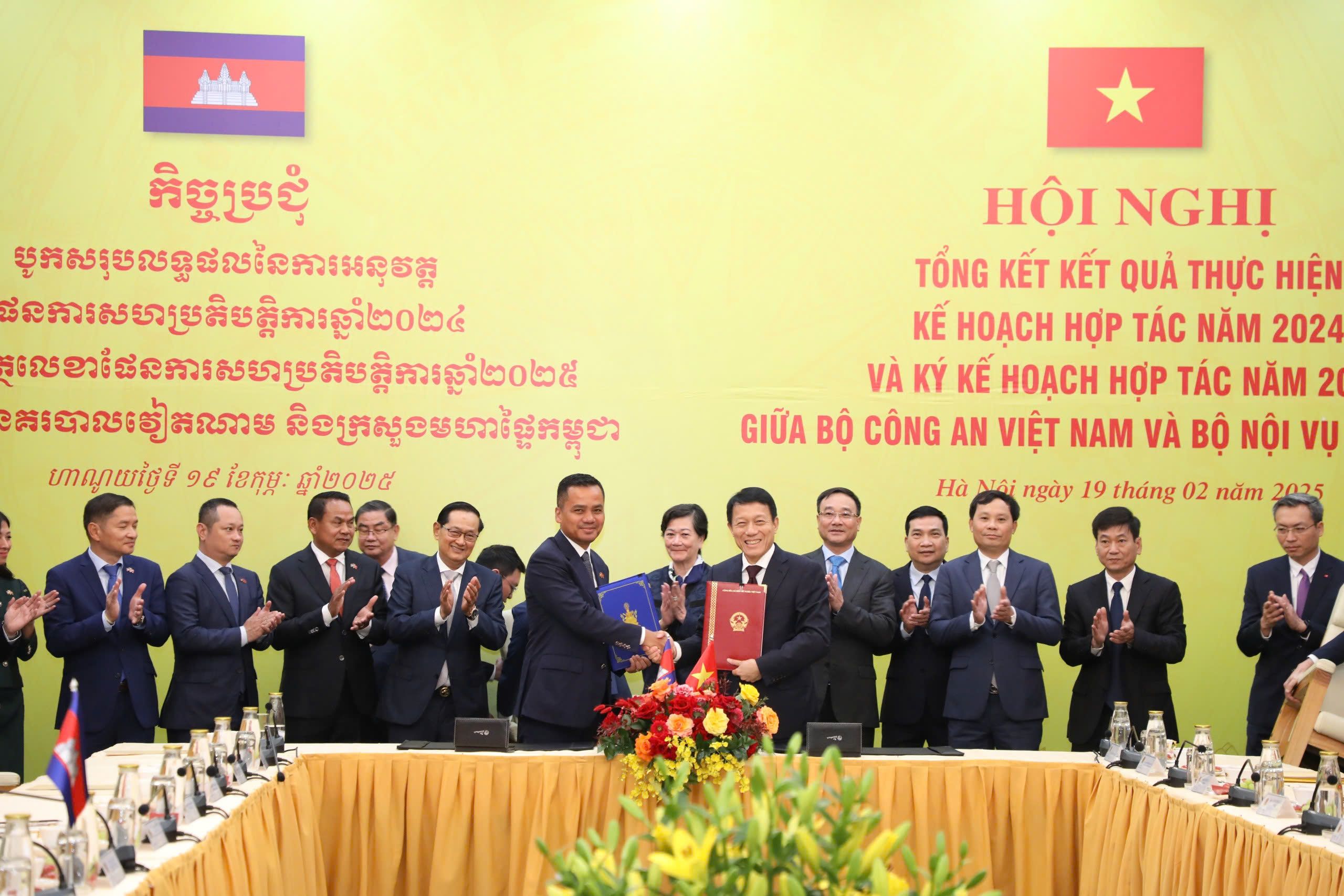 Đại tướng Lương Tam Quang, Ủy viên Bộ Chính trị, Bộ trưởng Bộ Công an Việt Nam và Phó Thủ tướng, Bộ trưởng Bộ Nội vụ Vương quốc Campuchia Sar Sokha đồng chủ trì Hội nghị tổng kết kết quả thực hiện Kế hoạch hợp tác năm 2024 và ký Kế hoạch hợp tác năm 2025 giữa hai Bộ tại Hà Nội, ngày 19/2/2025.