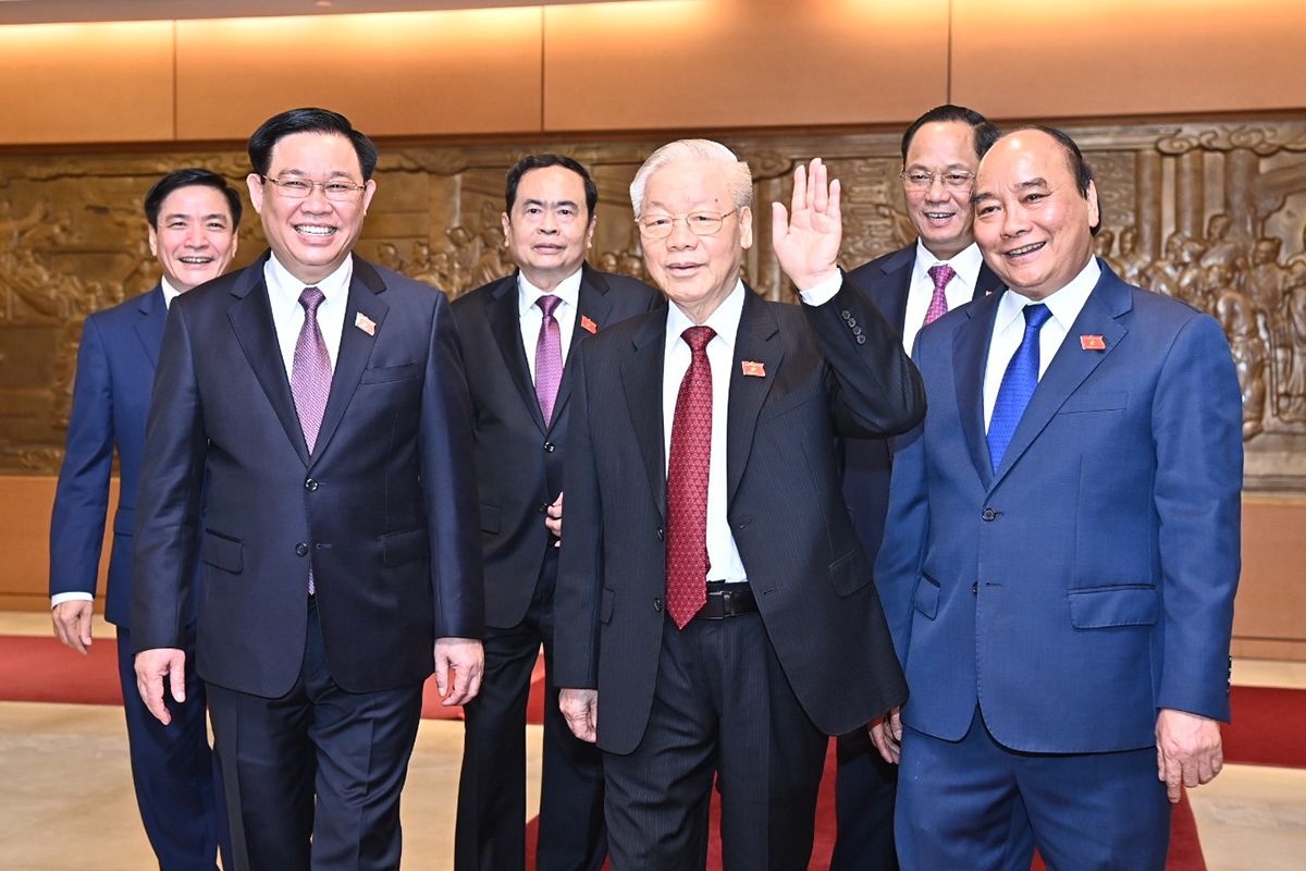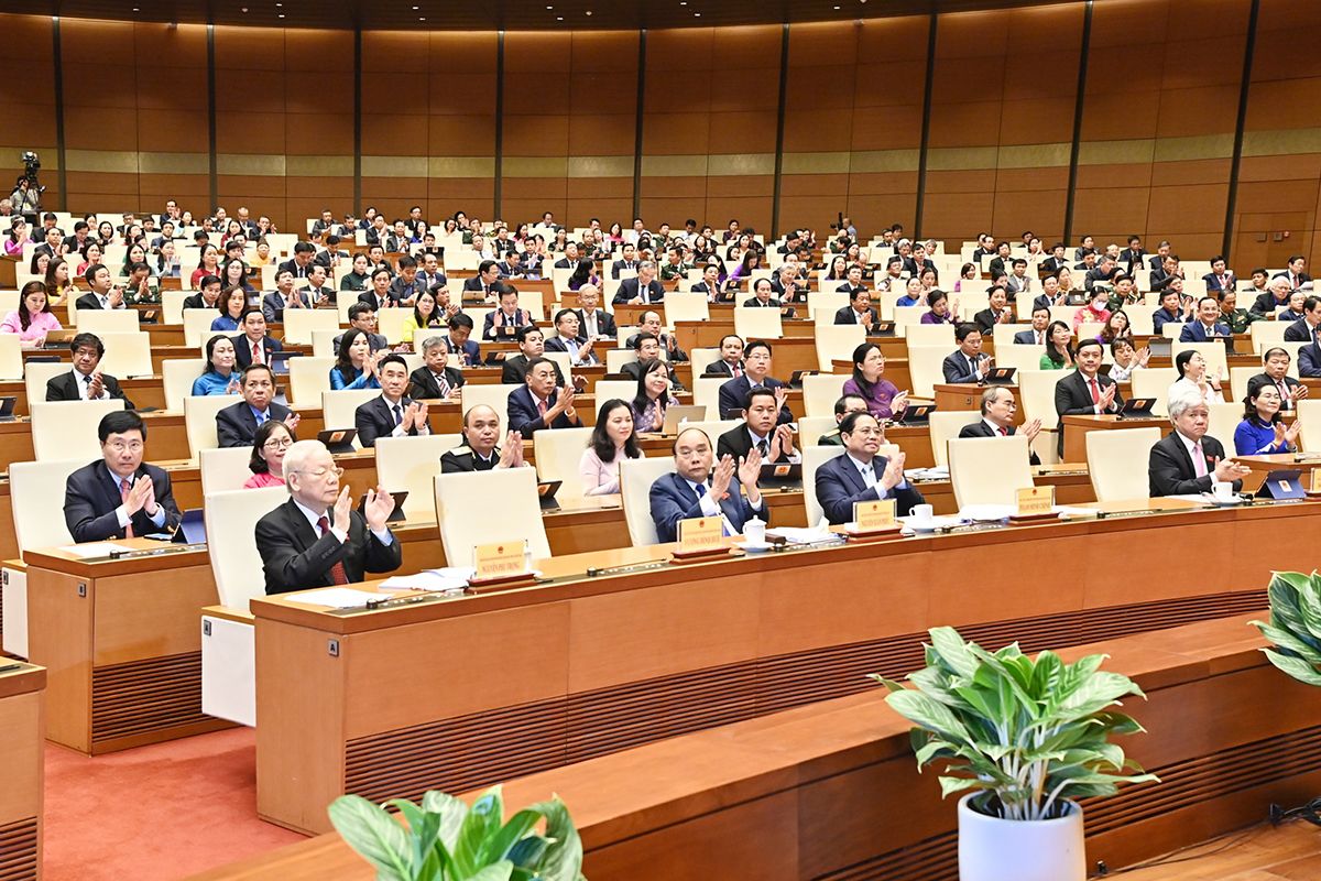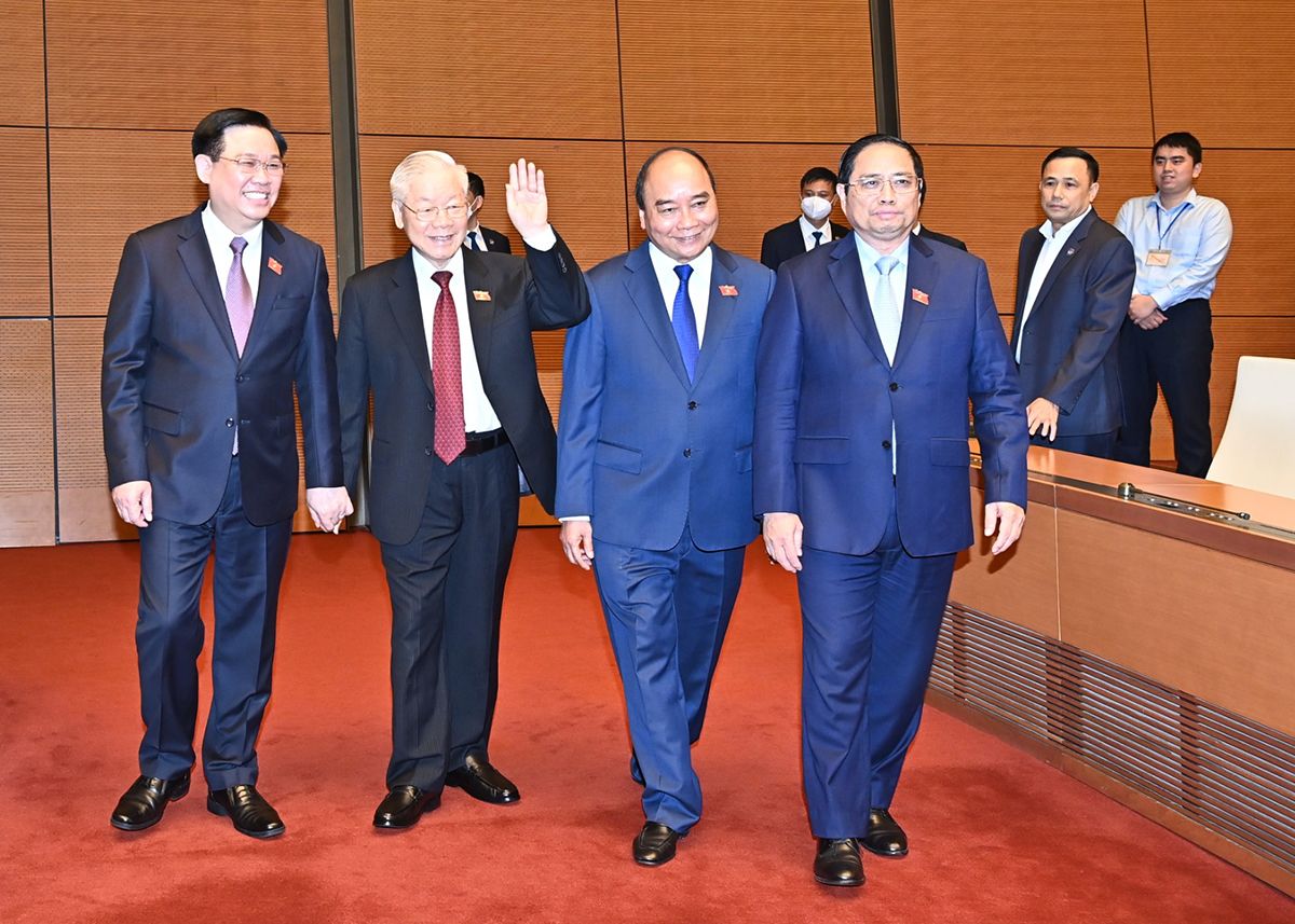 Tổng Bí thư Nguyễn Phú Trọng, Chủ tịch nước Nguyễn Xuân Phúc, Thủ tướng Phạm Minh Chính, Chủ tịch Ủy ban Trung ương Mặt trận Tổ quốc Việt Nam Đỗ Văn Chiến cùng các vị đại biểu Quốc hội khóa XV tại phiên bế mạc.