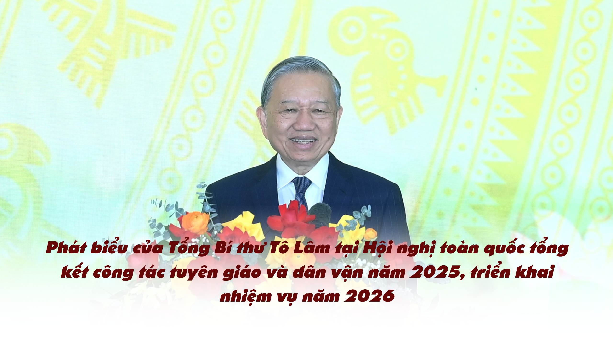 Hôm nay, tôi cùng các đồng chí Bộ Chính trị, Ban Bí thư, lãnh đạo các cơ quan Trung ương vui mừng đến dự Hội nghị toàn quốc tổng kết công tác tuyên giáo và dân vận của Đảng năm 2025, triển khai nhiệm vụ năm 2026 - Hội nghị tổng kết công tác năm đầu tiên sau khi hợp nhất Ban Tuyên giáo Trung ương và Ban Dân vận Trung ương, cơ quan tham mưu chiến lược về công tác tuyên giáo và dân vận của Đảng. Đặc biệt, hội nghị hôm nay diễn ra vào thời điểm toàn Đảng, toàn dân và toàn quân đang nỗ lực hoàn thành các chỉ tiêu, mục tiêu nhiệm kỳ Đại hội XIII của Đảng, tiếp tục hoàn thành tốt công tác chuẩn bị tổ chức Đại hội Đại biểu toàn quốc lần thứ XIV của Đảng.
