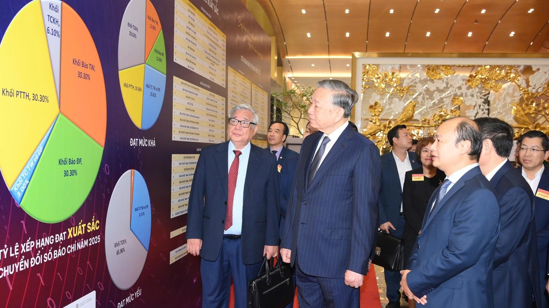 Trong khuôn khổ Hội nghị tổng kết công tác tuyên giáo và dân vận năm 2025, triển khai nhiệm vụ năm 2026, Tổng Bí thư Tô Lâm và các đại biểu tham quan không gian trưng bày sách, triển lãm ảnh và thành tựu chuyển đổi số trong báo chí.