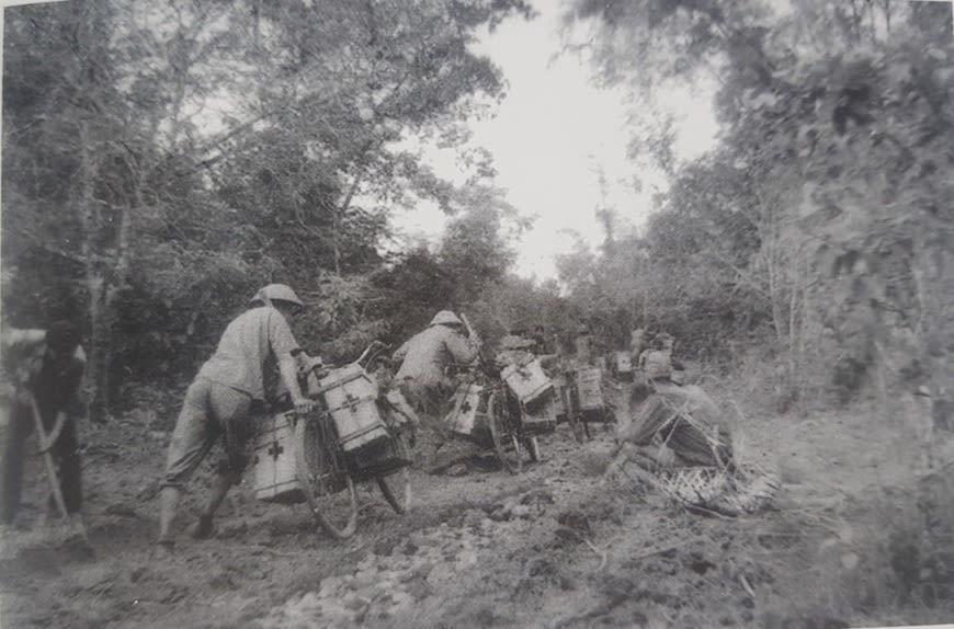 Các chiến sĩ quân y, quân dược dùng xe đạp thồ đưa thuốc men ra mặt trận. Ảnh tư liệu