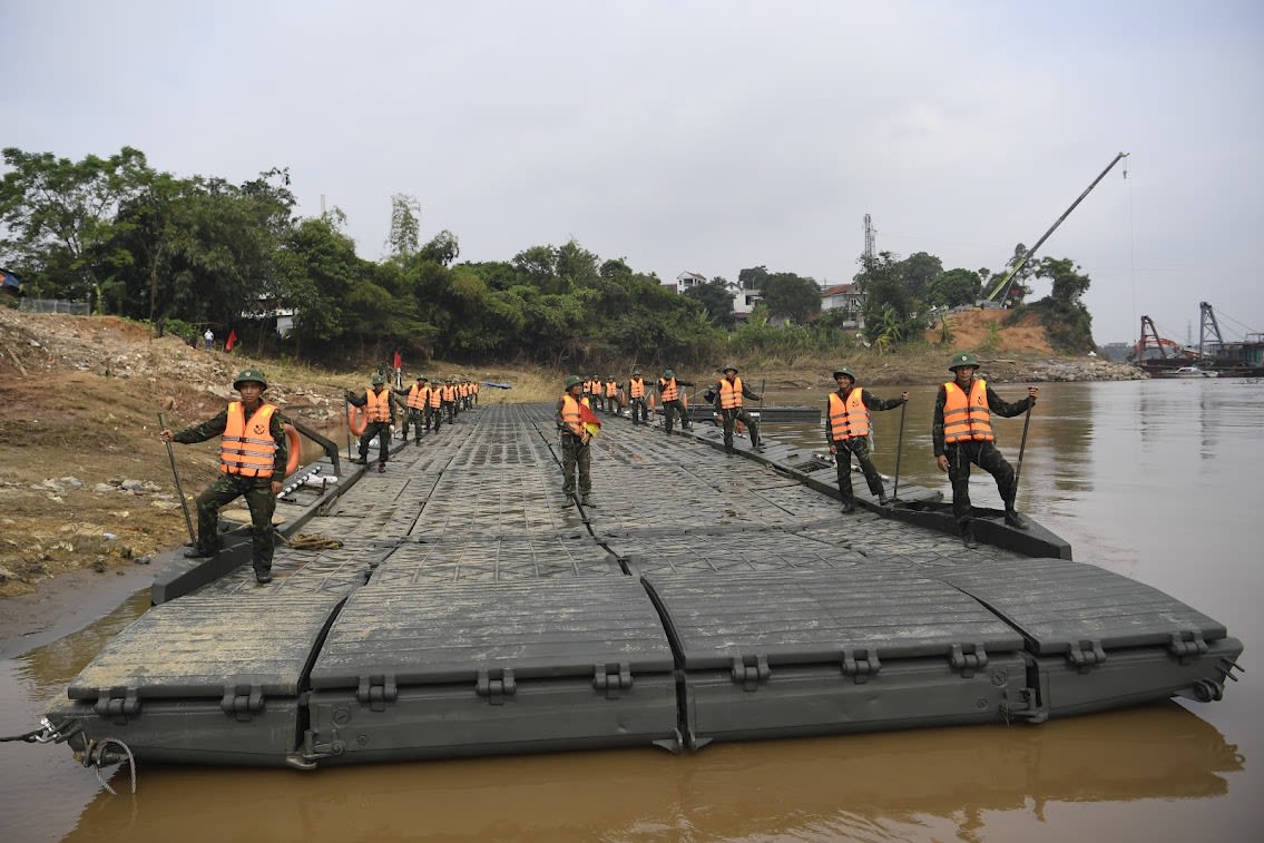 Bộ đội Lữ đoàn 249 thực hiện lai dắt, thả neo, khớp nối các phà nhịp với nhau. Ảnh: qdnd