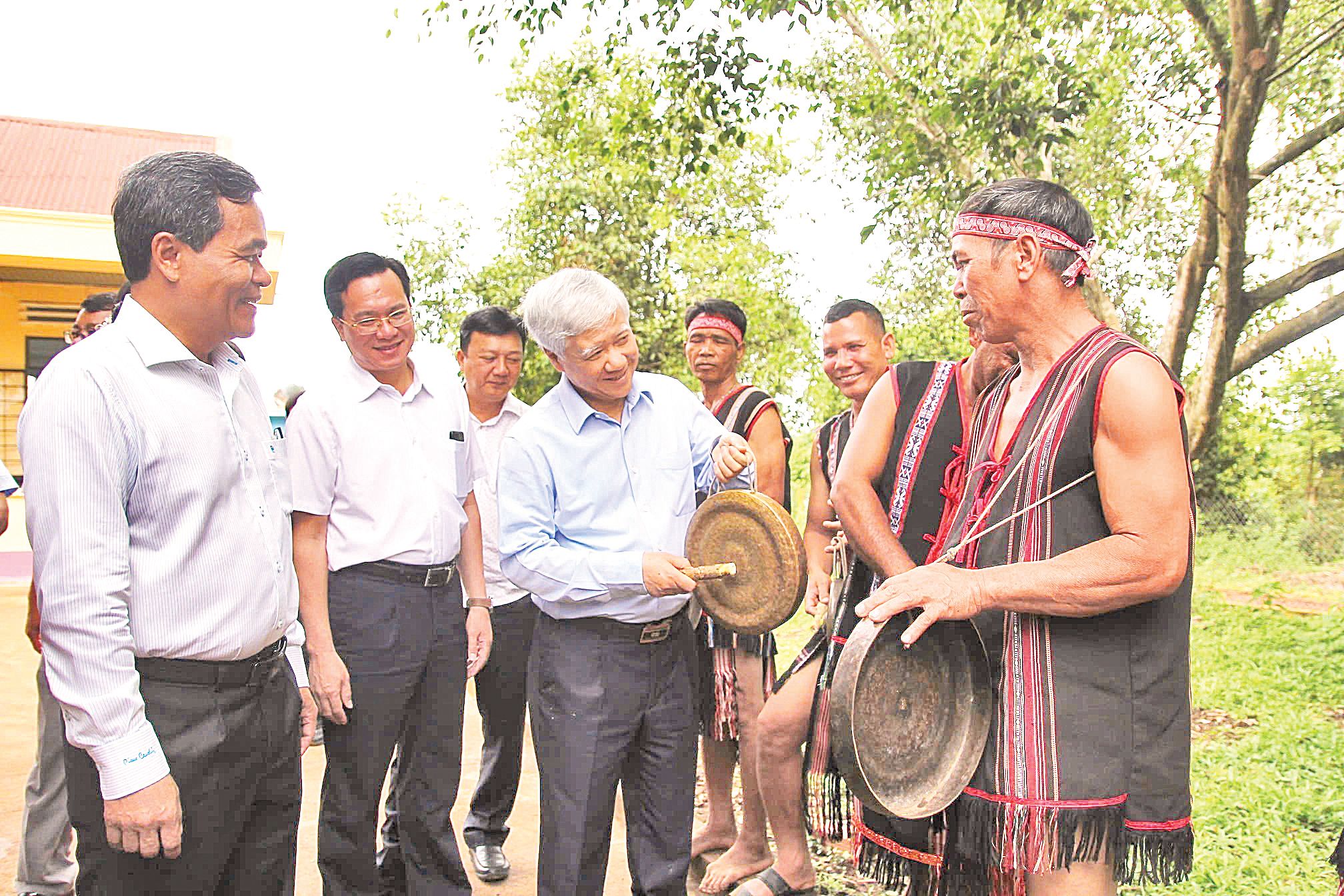 Chủ tịch Uỷ ban Trung ương Mặt trận Tổ quốc Việt Nam Đỗ Văn Chiến cùng đoàn công tác tặng bộ cồng chiêng cho người dân xã Chư Păh (tỉnh Gia Lai). Ảnh: HỒNG ĐIỆP/TTXVN