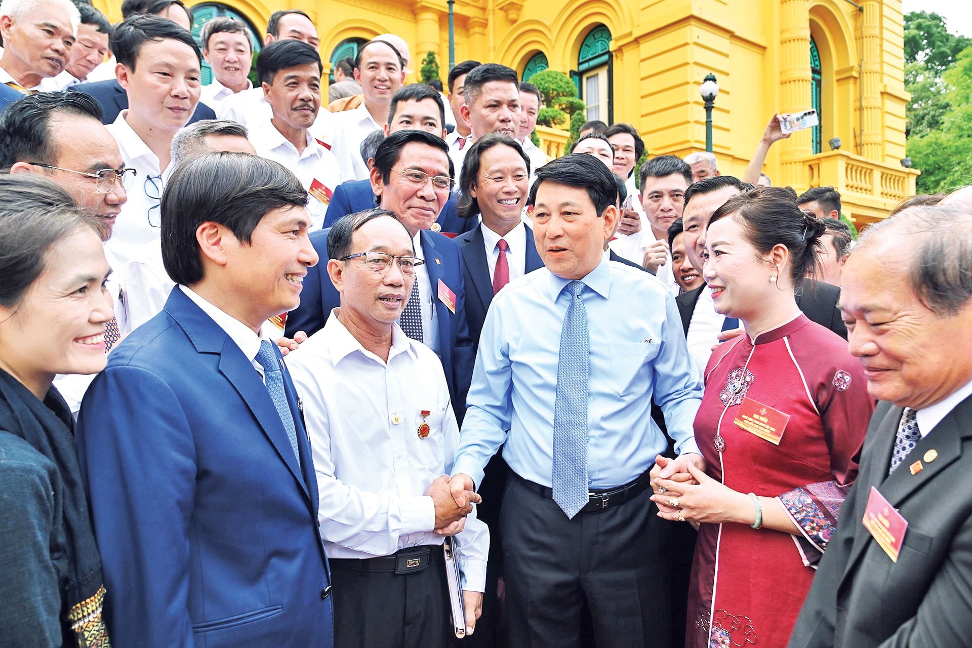 Chủ tịch nước Lương Cường với các nghệ nhân làng nghề tiêu biểu toàn quốc và các đại biểu tại buổi gặp mặt, ngày 10/6/2025. Ảnh: THUỶ NGUYÊN