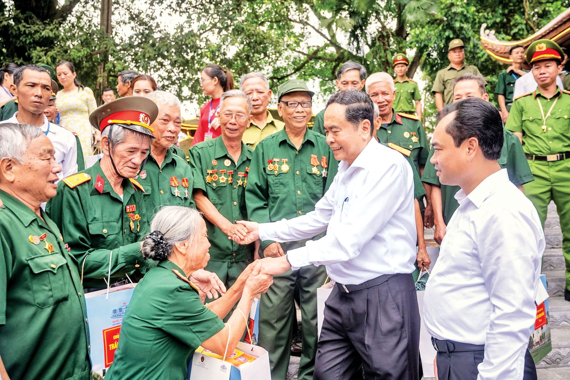 Chủ tịch Quốc hội Trần Thanh Mẫn với gia đình chính sach, người có công với cách mạng tại Khu di tích lịch sử Quốc gia 27/7, tỉnh Thái Nguyên. Ảnh: DUY LINH