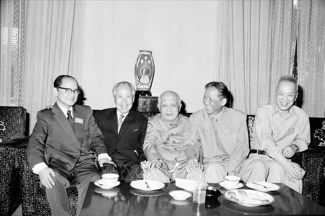 Các đồng chí: Tôn Đức Thắng, Lê Duẩn, Hoàng Quốc Việt, Nguyễn Hữu Thọ và Huỳnh Tấn Phát đại diện cho khối đại đoàn kết các dân tộc Việt Nam tại Đại hội Mặt trận thống nhất Việt Nam (31/1/1977). Ảnh: TTXVN