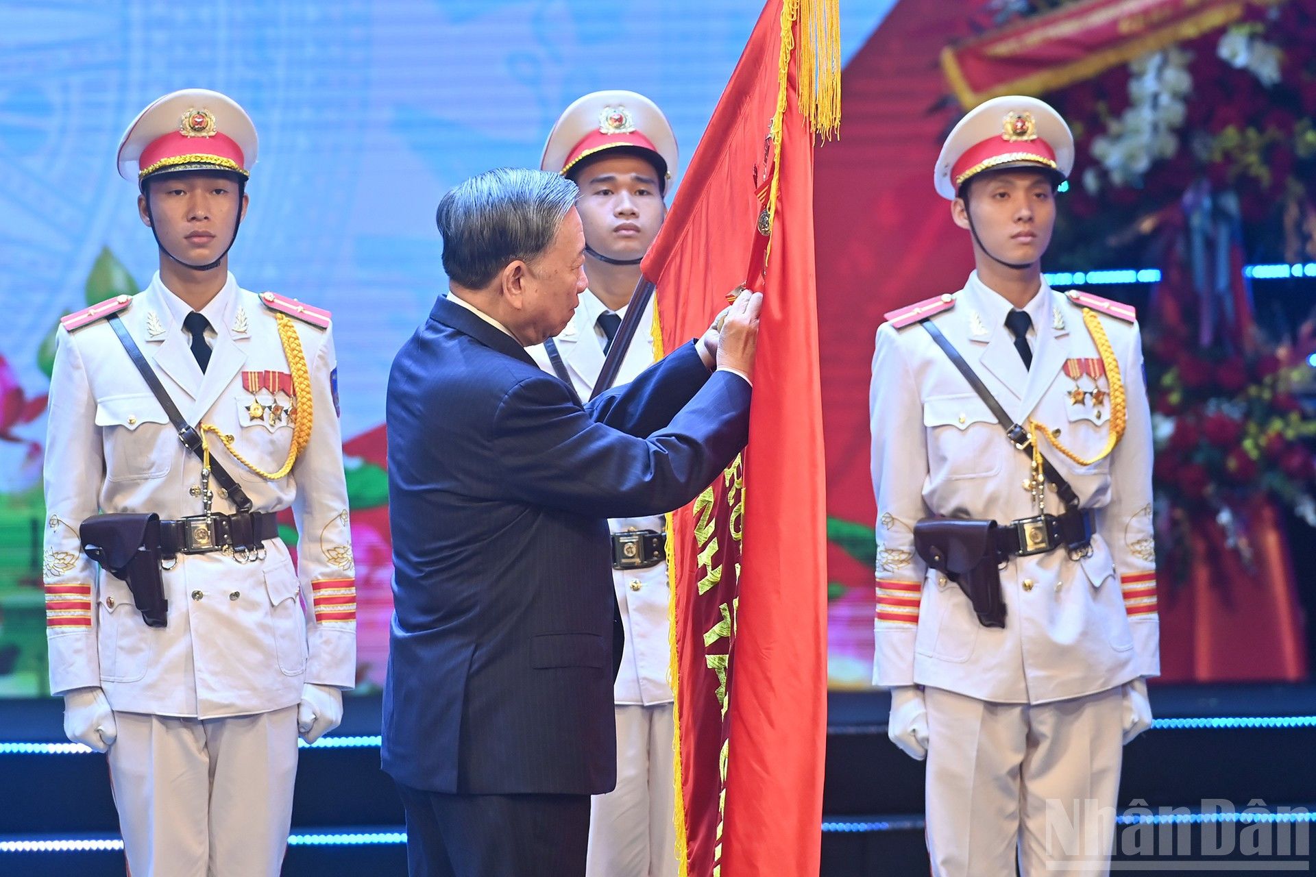 Tổng Bí thư Tô Lâm gắn Huân chương Độc lập hạng Nhất lên lá cờ truyền thống của ngành tài chính. Ảnh: ĐĂNG KHOA