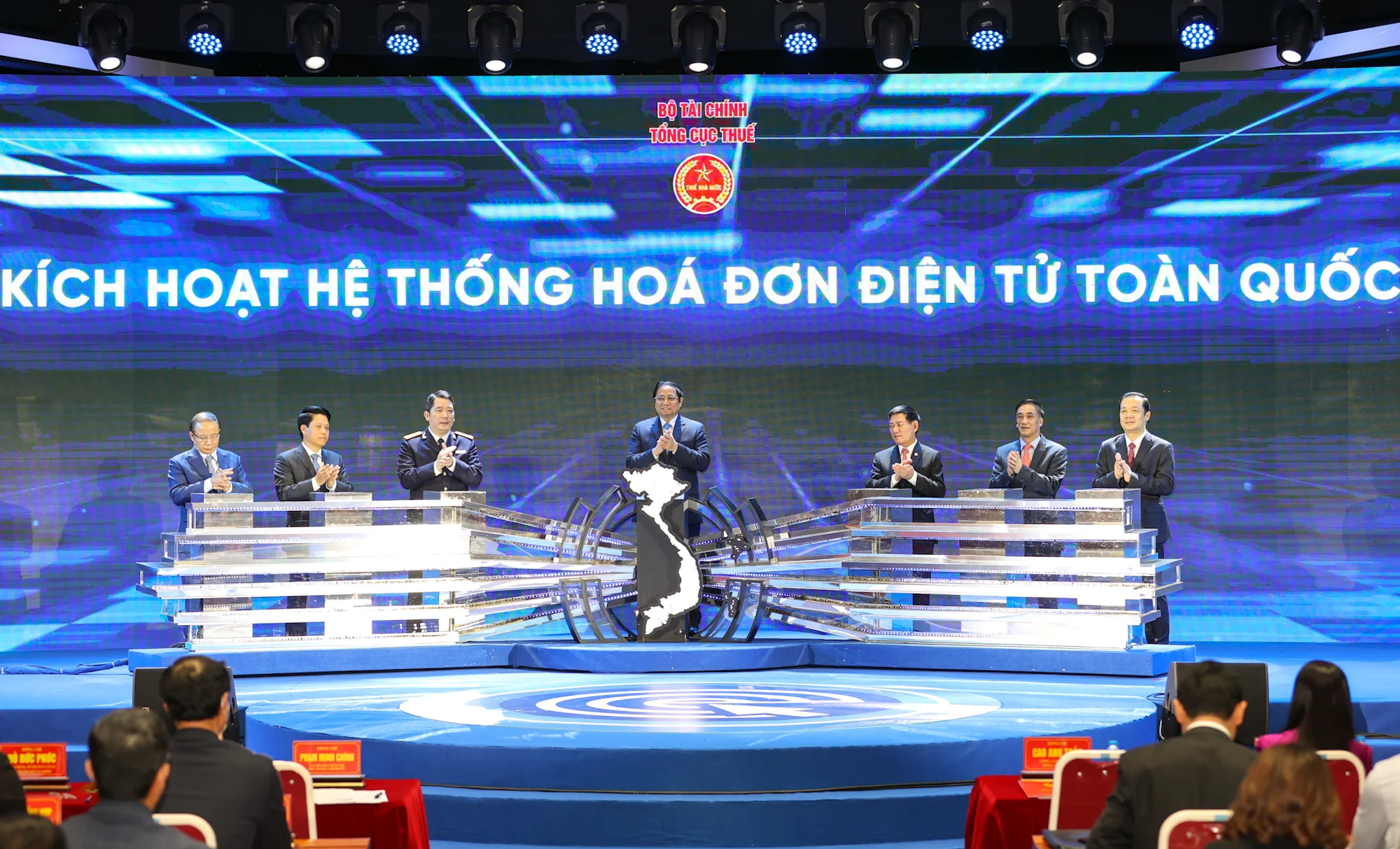 Thủ tướng Chính phủ Phạm Minh Chính cùng các đại biểu kích hoạt hệ thống hóa đơn điện tử áp dụng trên phạm vi toàn quốc, ngày 21/4/2022