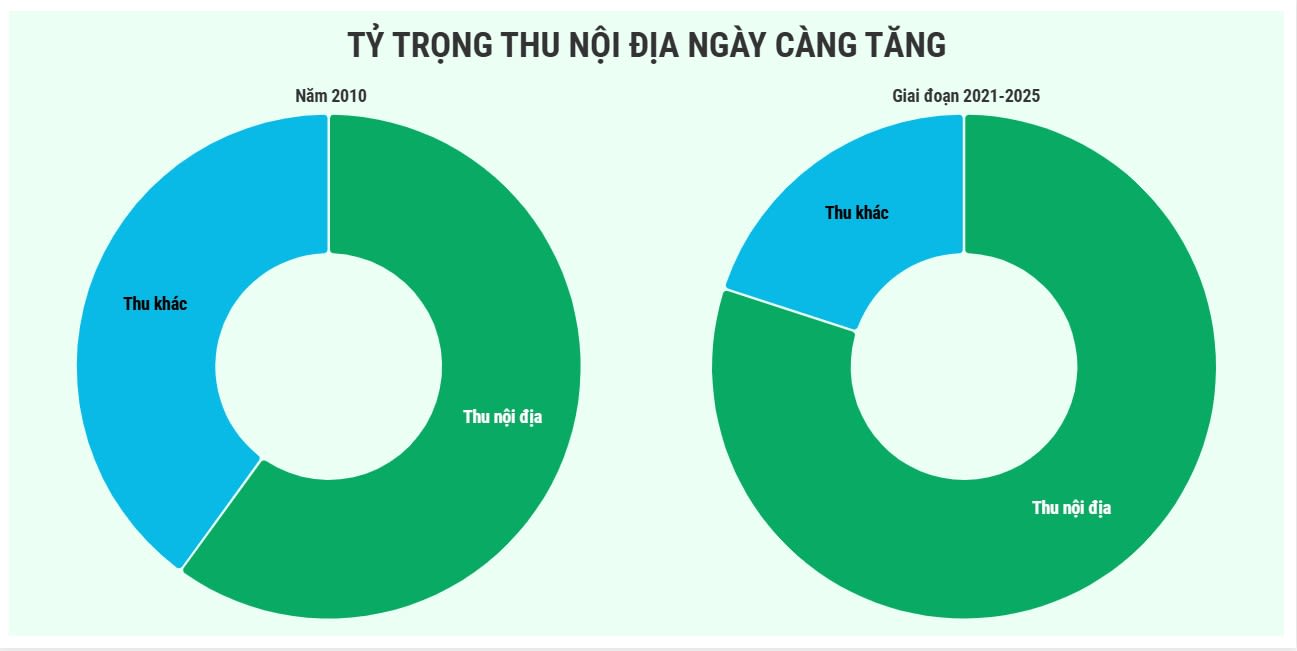 Thời gian qua, cơ cấu thu ngân sách Nhà nước chuyển biến theo hướng bền vững: thu nội địa ngày càng chiếm tỷ trọng cao trong tổng thu ngân sách Nhà nước, cụ thể, từ mức trên 60% năm 2010 đã tăng lên hơn 80% vào giai đoạn 2021-2025, trong bối cảnh Chính phủ ban hành hàng loạt các chính sách miễn, giảm, gia hạn nhiều loại thuế, phí, tiền thuê đất với quy mô lớn trong thời gian này, với số tiền được miễn, giảm, gia hạn lên đến hàng trăm nghìn tỷ đồng. Điều này phản ánh cơ cấu thu đang tiếp tục chuyển dịch theo hướng xuất phát từ nội lực sản xuất kinh doanh trong nước, bảo đảm tính bền vững cho nguồn thu ngân sách Nhà nước trong dài hạn.